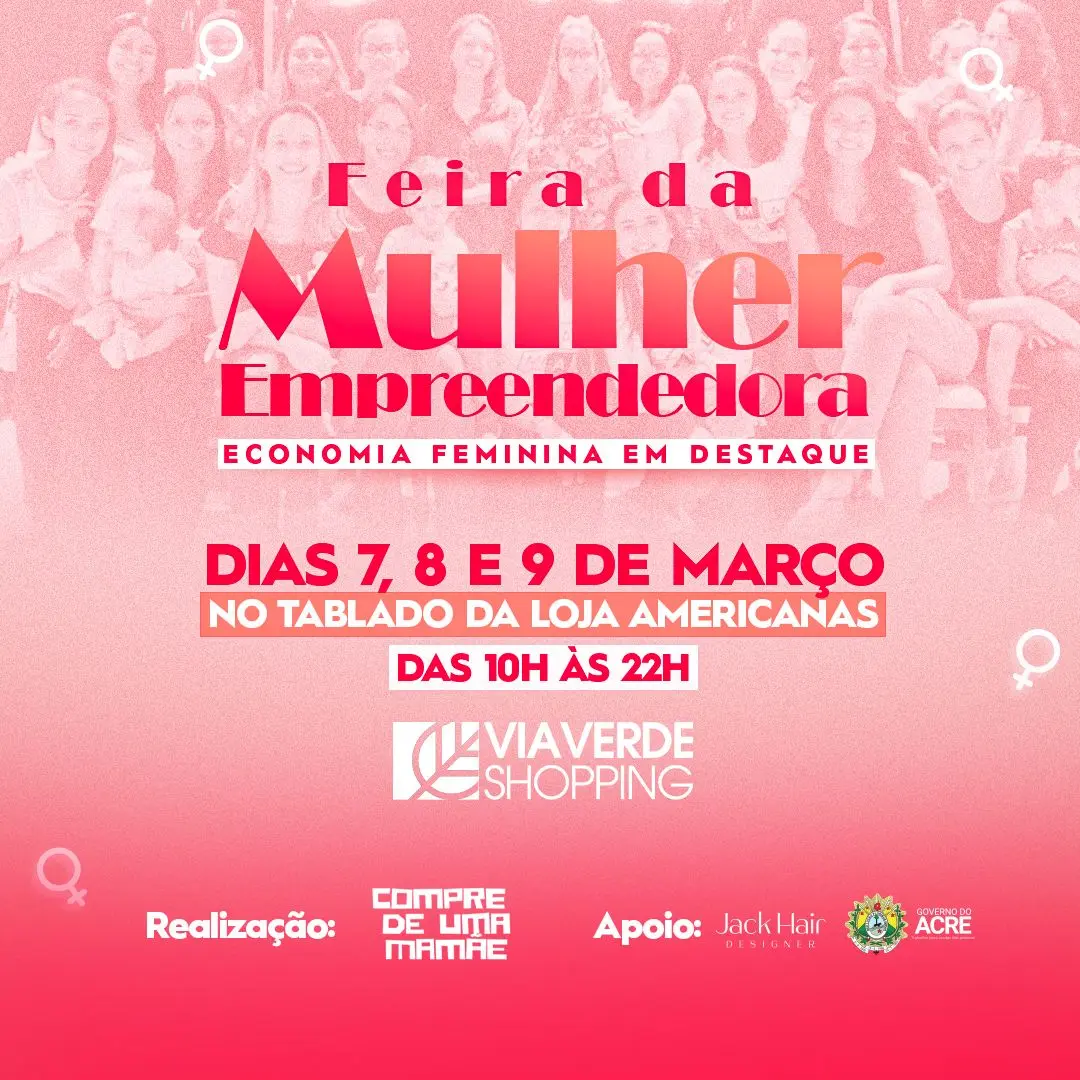 Em celebração ao Dia Internacional da Mulher, a Rede de Empreendedorismo Materno do Acre, conhecida como “Compre de uma Mamãe”, anuncia a realização da “Feira da Mulher Empreendedora – Economia Feminina em Destaque”. O evento está marcado para os dias 07, 08 e 09 de março, e acontecerá no Via Verde Shopping.