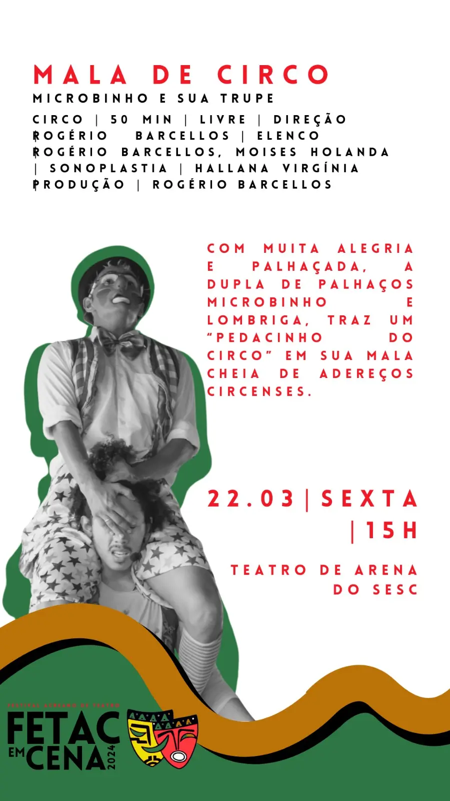 Responsável pelo espetáculo Mala de Circo, Rogério Barcellos, o Microbinho, interpreta o personagem desde muito novo, quando criança: “Sou filho do palhaço Rufino, então já estou nesse meu caminho desde cedo. E é um prazer imenso estar participando mais uma vez do Fetac em Cena, esse festival aí que vem também para comemorar o Dia Mundial do Teatro, dia 27 de março”, revelou Rogério Barcellos, o Microbinho.