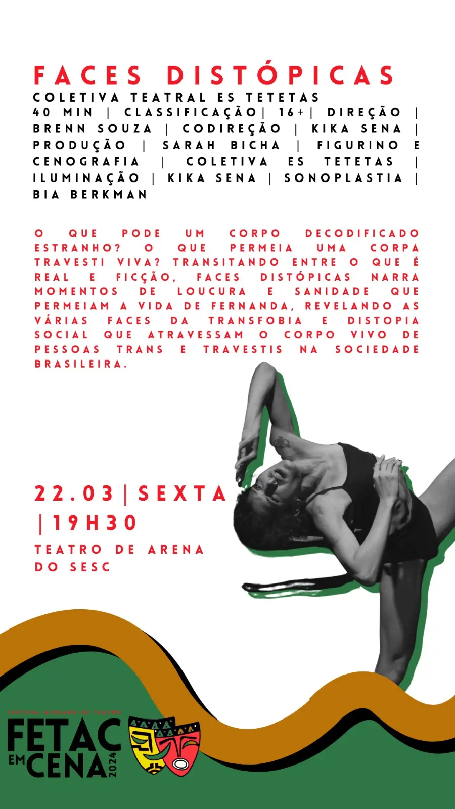 O espetáculo Faces Distópicas, da Coletiva Teatral Es Tetetas, lembra a história de Fernanda Machado, uma travesti acreana de Rio Branco, que foi assassinada na rua Minas Gerais, no bairro Preventório, em 2020. O caso impactou moradores de Rio Branco e, como forma de manter a memória de Fernanda viva, o espetáculo levanta reflexões como: “O que pode um corpo decodificado estranho? O que permeia uma corpa travesti viva?”.