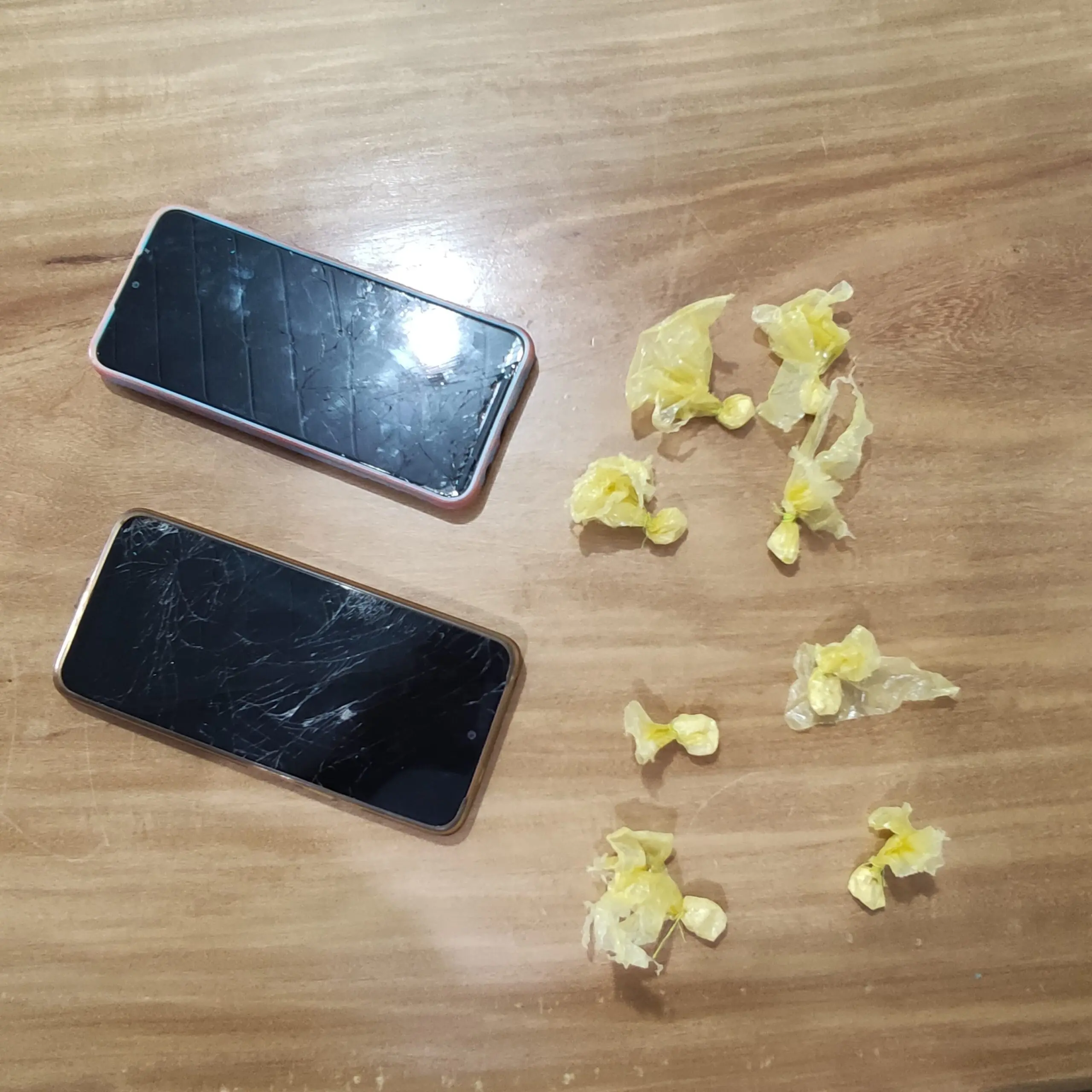 Dois celulares e uma grande quantidade de entorpecentes foram apreendidos/Foto: PCAC