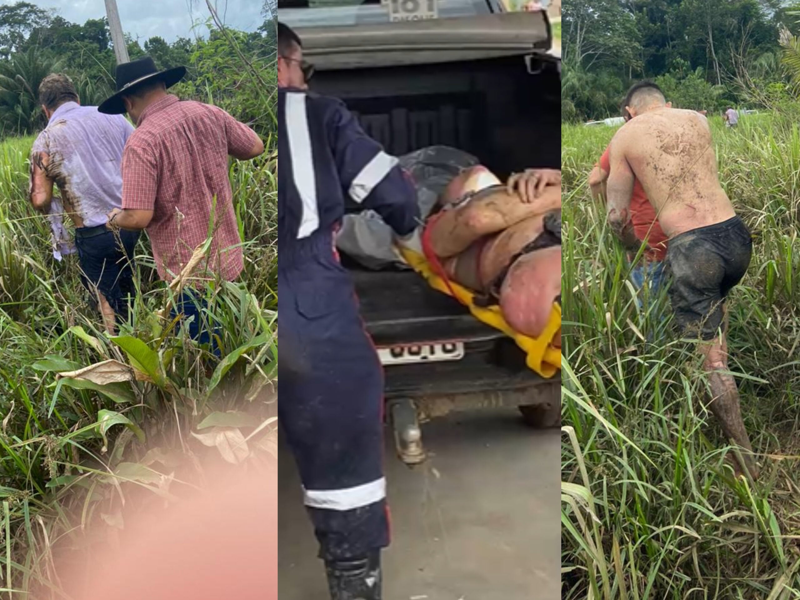 Imagens enviadas à reportagem do ContilNet mostram três dos cinco sobreviventes que estavam a bordo do avião que caiu na manhã desta segunda-feira (18), em Manoel Urbano, no interior do Acre.