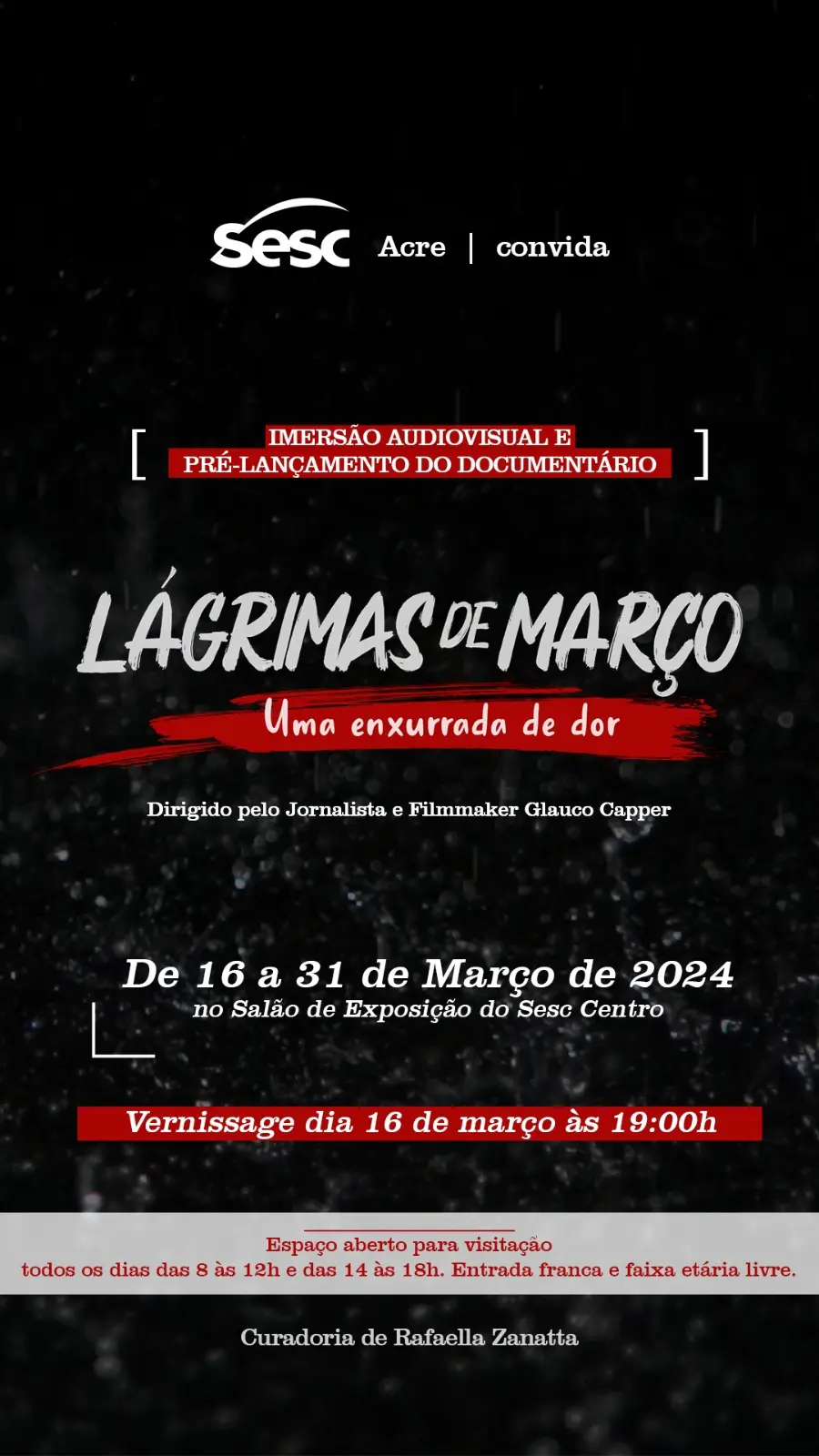 Por fim, Glauco Capper convida toda a população para sua exposição/imersão. A exposição vai acontecer de 16 a 31 de março de 2024, no Salão de Exposição do Sesc Centro, com entrada gratuita. A abertura/vernissage acontece no dia 16 de Março às 19h. A partir do dia 17, o espaço segue aberto para visitação das 8 às 12h e das 14 às 18h.