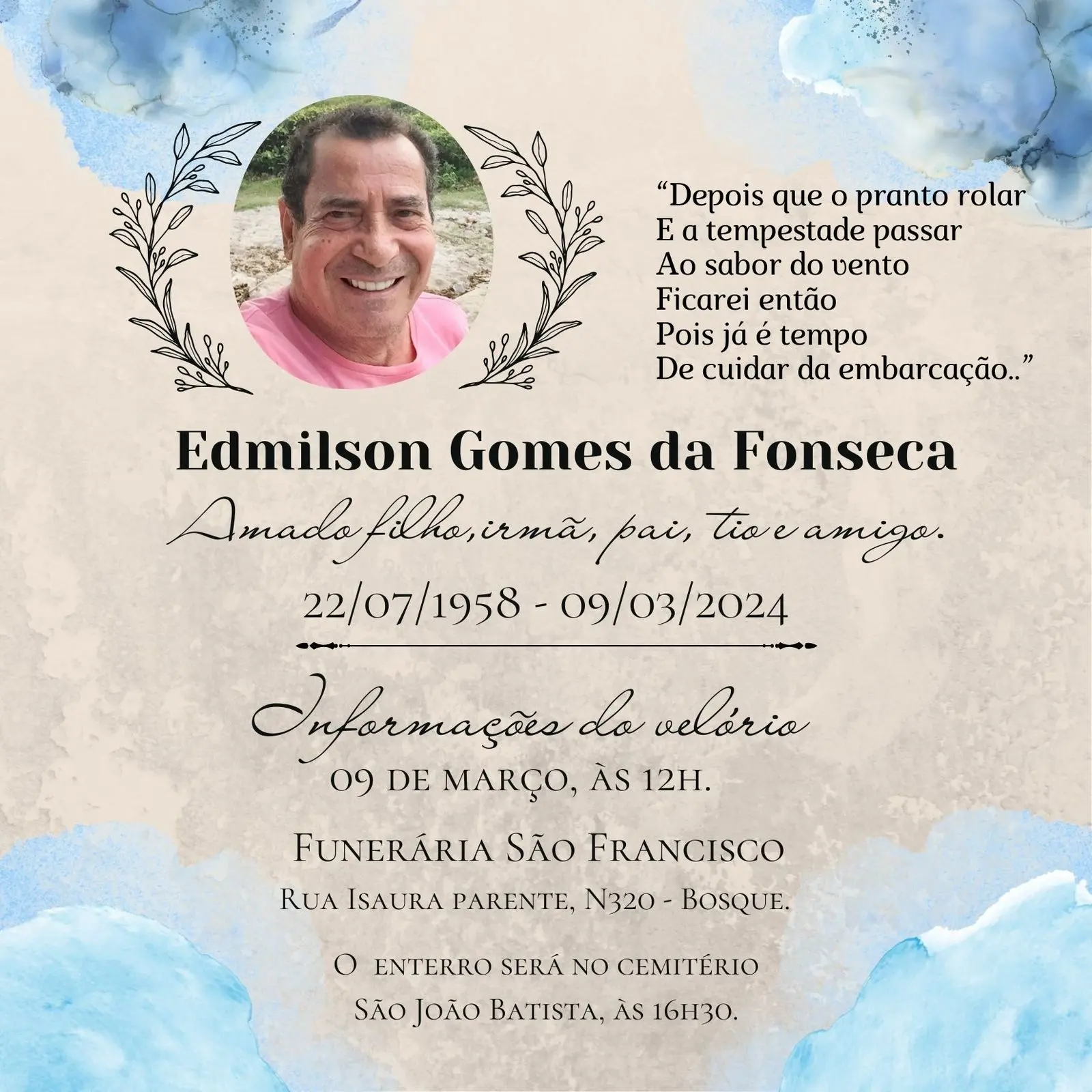Aposentado, há anos “Papinha” vivia no Rio de Janeiro, mas estava em Rio Branco em visita a familiares. Na noite de sexta-feira, passou mal. Levado ao hospital, não resistiu.