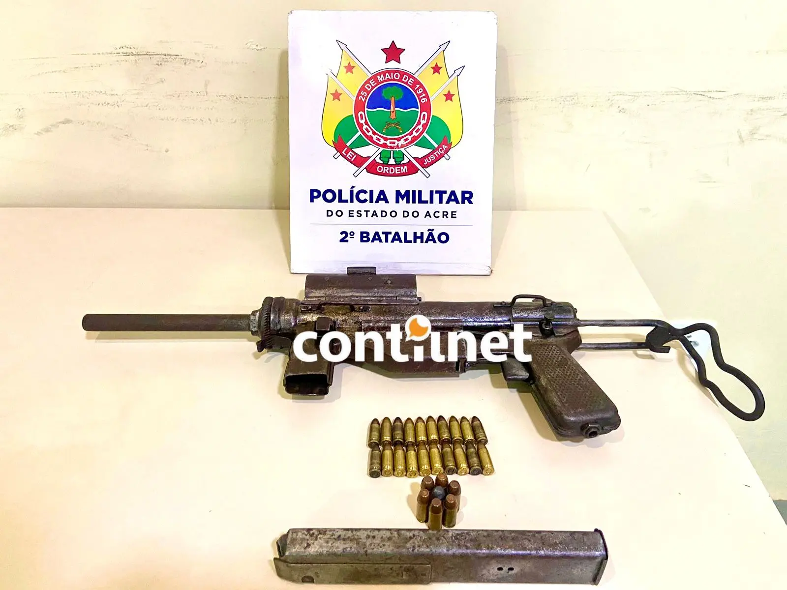 A prisão em flagrante de Francisco Bruno ocorreu no último sábado (23) no bairro Taquari, Segundo Distrito de Rio Branco (AC), após uma denúncia anônima indicar que o suspeito ostentava armas de fogo em suas redes sociais. A ação policial resultou na apreensão de uma submetralhadora de guerra, calibre 9mm, com munições, além de outras munições de uso restrito.