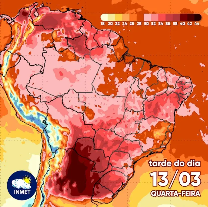 As máximas oscilam entre 31°C e 34°C, podendo chegar a 35°C em alguns municípios