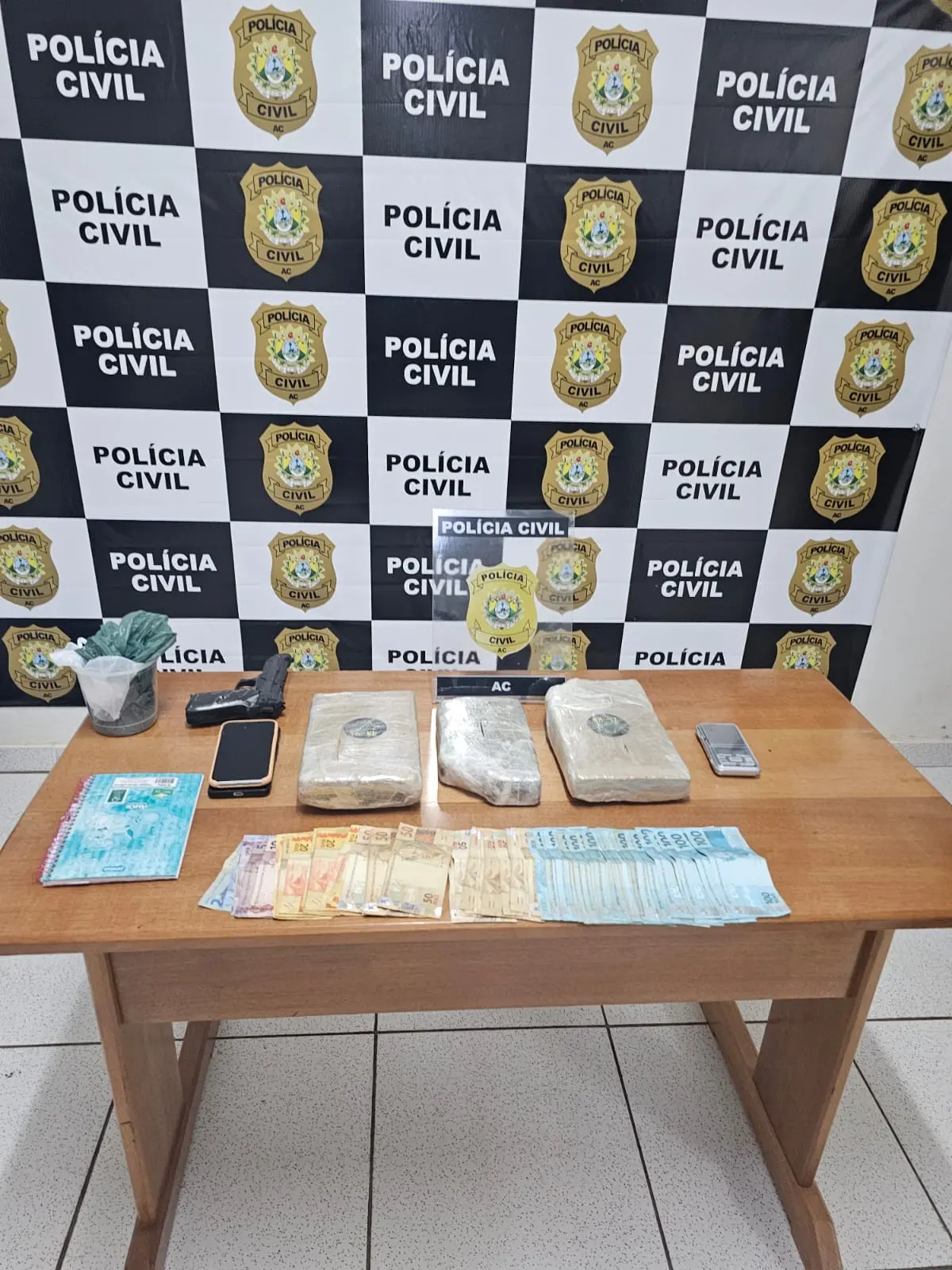 Polícia Civil apreende três quilos de entorpecentes, dinheiro, moto e um acusado – Foto: Cedida