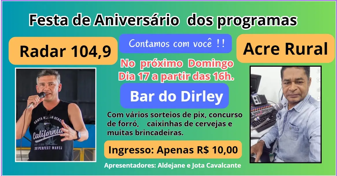 Na tarde deste domingo (17), a Chácara do Dirley será palco de uma festa memorável, marcando o aniversário do programa Radar 104, apresentado por Aldejane Pinto, e do Acre Rural, comandado por Jota Cavalcante, ambos com grande audiência nas rádios locais.