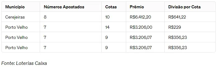 Os vencedores das apostas simples receberão R$ 1.068,70 cada, enquanto os sortudos dos bolões terão que dividir pouco mais de R$ 16 mil entre 42 cotas. Confira a divisão detalhada na tabela abaixo: