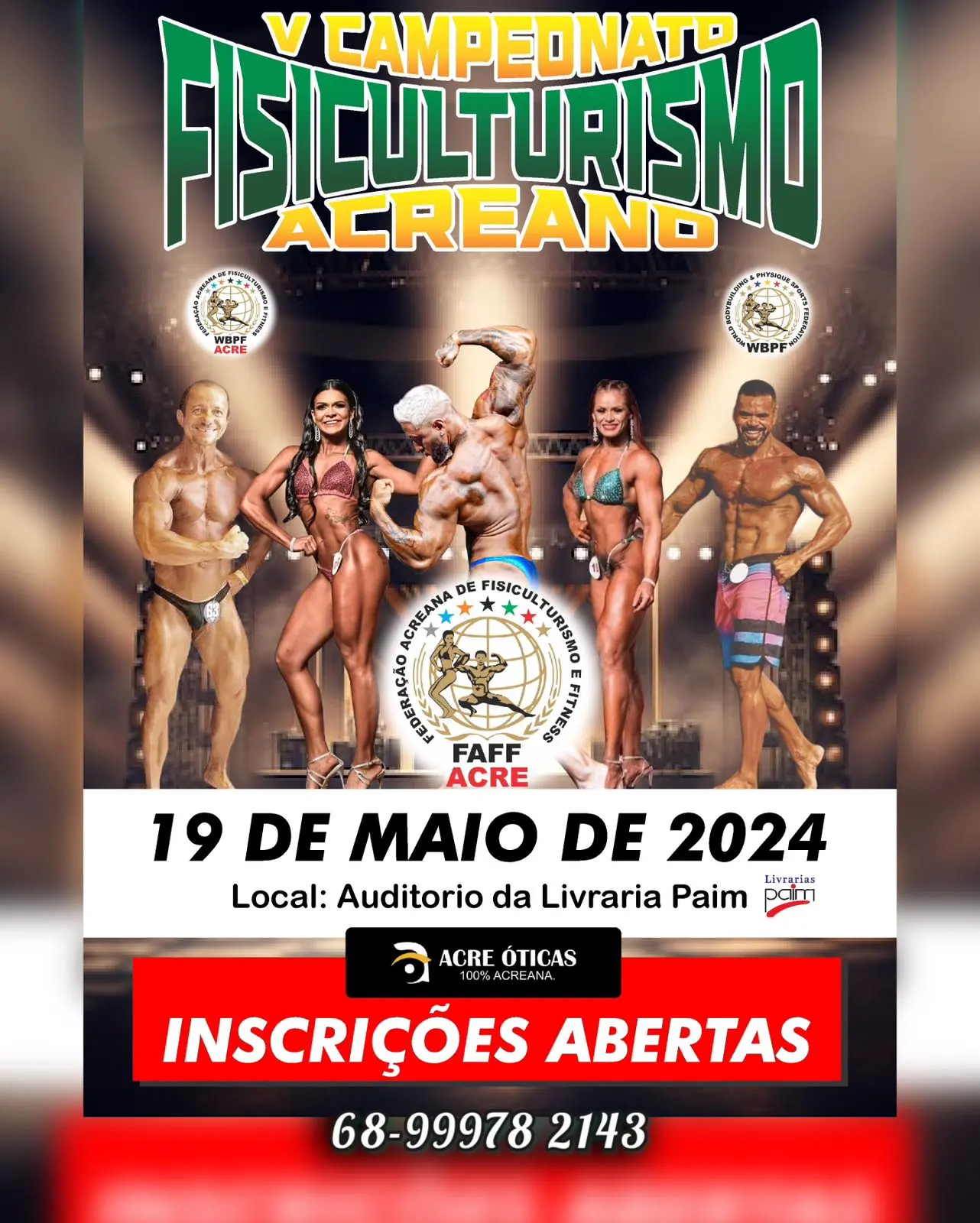 A Federação Acreana de Fisiculturismo e Fitness (WBPF/AC) promoverá o V Campeonato de Fisiculturismo Acreano, no auditório da Livraria Paim, no dia 19 de maio, a partir das 17 horas. Entre as categorias do evento, teremos as masculinas, BodyBuilder, Class Physique, Men’s Physique, e as femininas, Biquíni e Wellness. As inscrições estão abertas até 18 de maio.