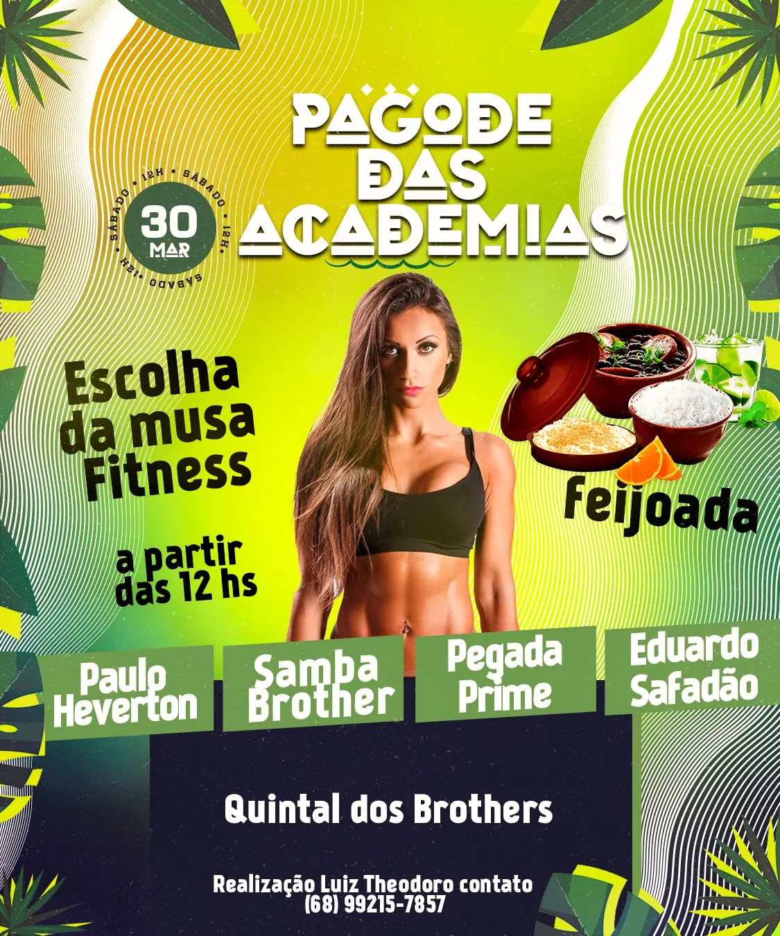 Vem ai mais uma super festa para agitar Rio Branco. Dia 30 de março no quintal do Brothers acontece o pagode das academias com show de Paulo Heventon, Samba Brohers, Pegada Prime e Eduardo Safadão. A grande atração da festa é a escolha da Musa Fitness com oito condidatas concorrendo ao título. Reservas de convites na Loja íris Tavares.