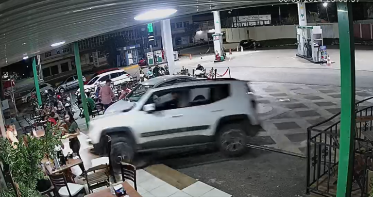 Na madrugada desta quinta-feira (7), um carro, modelo Jeep Renegade, invadiu a Pão de Queijo Conveniência, localizada num posto de gasolina que fica entre a Avenida Ceará e a Nações Unidas, em Rio Branco. Imagens da câmera de segurança mostram o exato momento em que o condutor invade o estabelecimento.