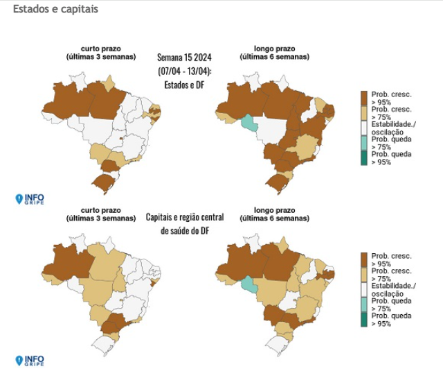 A atualização mostra que, no agregado nacional, há sinal de crescimento nas internações tanto na tendência de longo prazo (últimas seis semanas) quanto na de curto prazo (últimas três semanas).