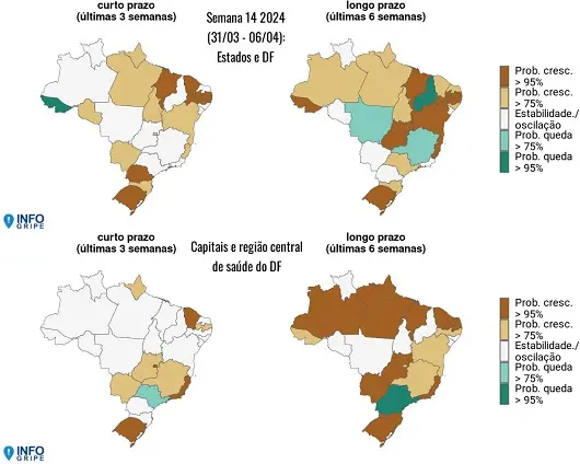 Na presente atualização, 18 estados apresentam sinal de crescimento de SRAG na tendência de longo prazo: Acre, Alagoas, Amazonas, Amapá, Bahia, Ceará, Distrito Federal, Espírito Santo, Goiás, Maranhão, Pará, Paraíba, Pernambuco, Rio Grande do Norte, Rio Grande do Sul, Santa Catarina, São Paulo e Tocantins.