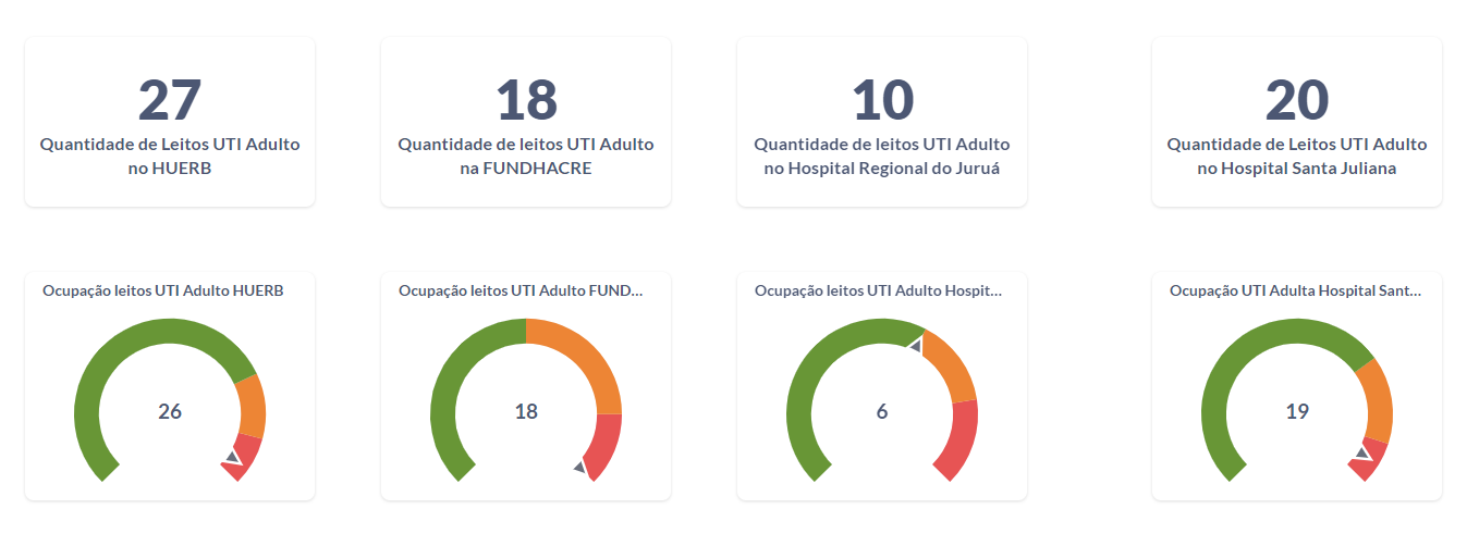 No Acre, segundo o Observatório em Saúde, no Pronto-Socorro de Rio Branco, são 27 leitos de UTI adulto, sendo 26 ocupados. Já na Fundação Hospitalar do Acre (Fundhacre), são 18 leitos de UTI, sendo com 100% de taxa de ocupação.