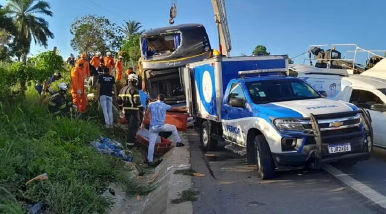 Um grave acidente envolvendo um ônibus de turismo deixou ao menos nove mortos e 23 feridos na madrugada desta quinta-feira, na Bahia. A Polícia Rodoviária Federal da Bahia confirmou ao GLOBO que, dentre as vítimas fatais, estão uma mulher grávida e crianças. Ainda segundo a PRF, até o momento, a principal linha de investigação para a possível causa do tombamento é “velocidade incompatível”.