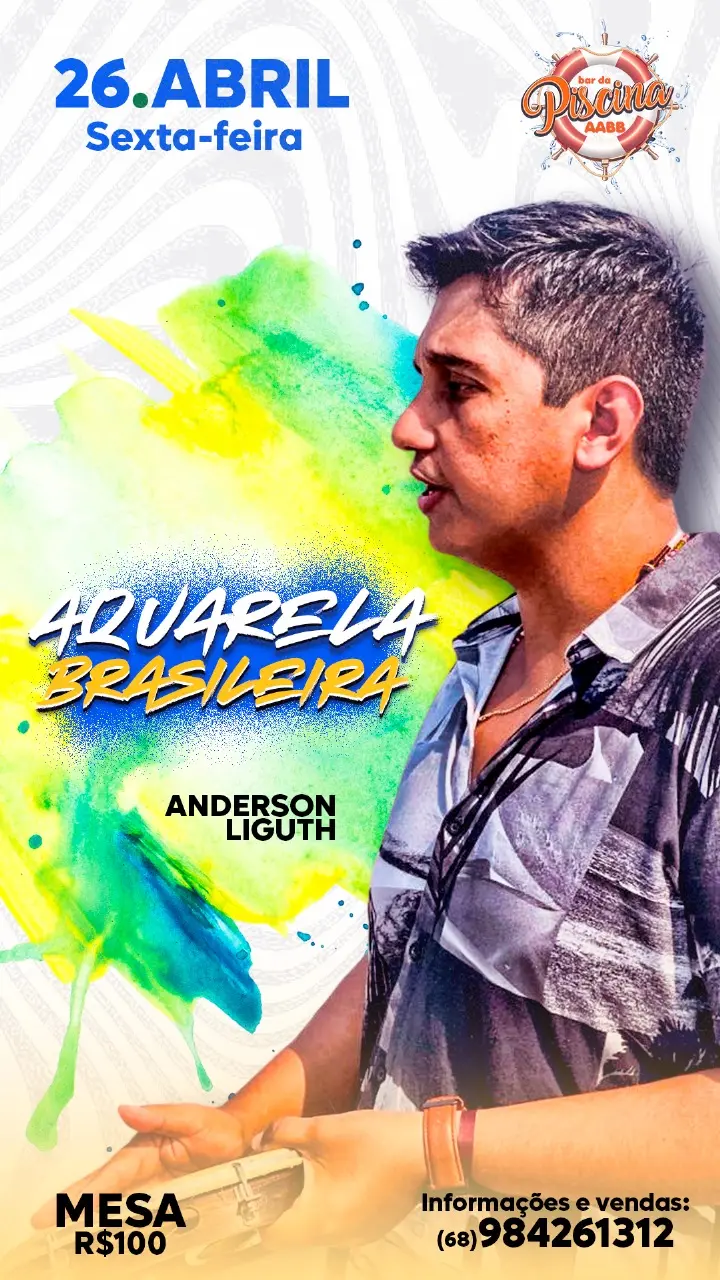 O cantor e compositor Anderson Martins, mas conhecido como Liguth, conhecido por trazer ritmos como samba MBP, Bossa Nova e música nacional em geral a cerca de 22 anos na cena local em Rio Branco, cumprirá agenda de dois shows no mês de abril, nomeados “Aquarela Brasileira”.