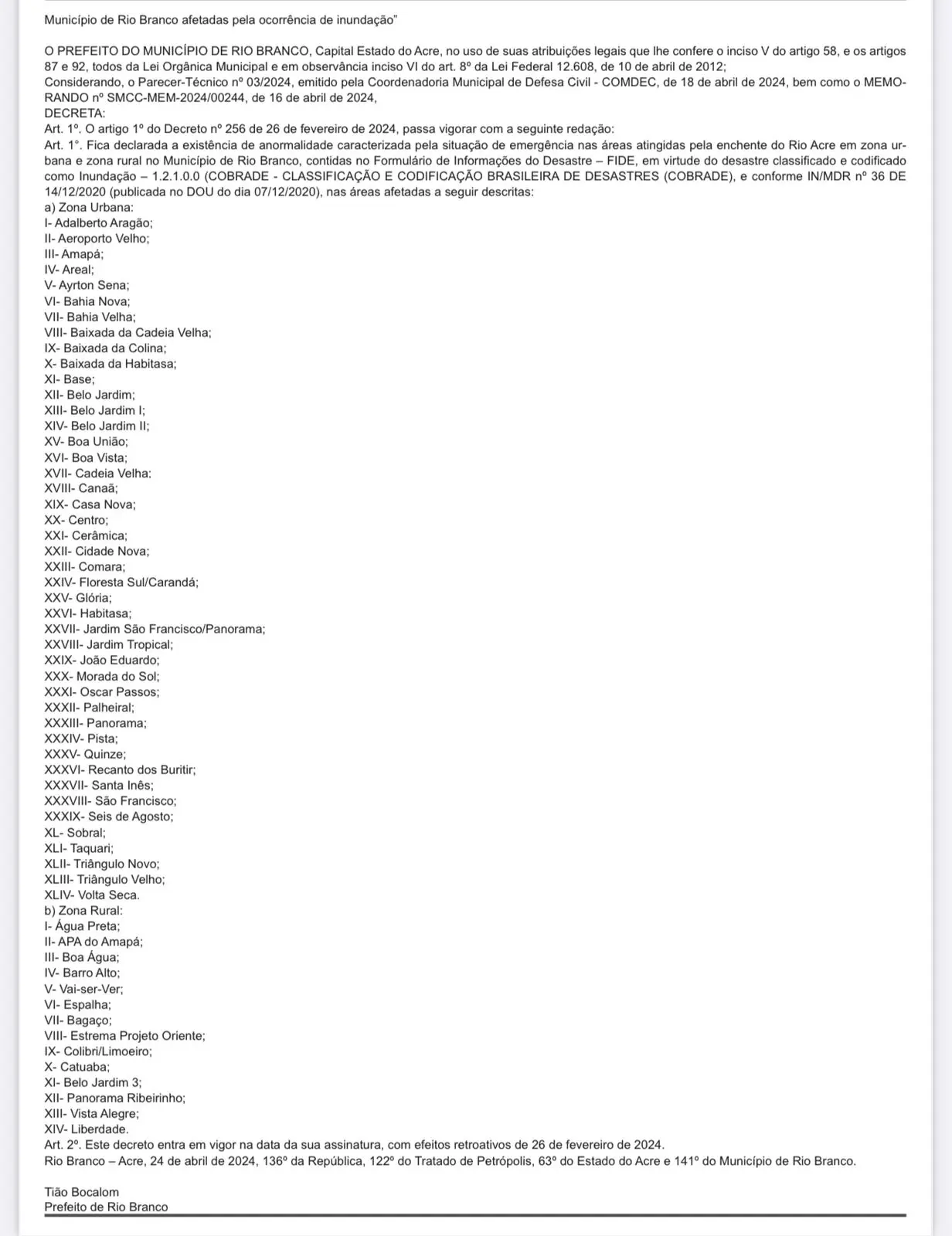 Na edição do Diário Oficial desta sexta-feira (26), o prefeito Tião Bocalom (PL) alterou o decreto nº 256 de 26 de fevereiro de 2024 e incluiu novos bairros na lista de locais com anormalidade caracterizada pela situação de emergência nas áreas atingidas pela enchente do Rio Acre em Rio Branco.
