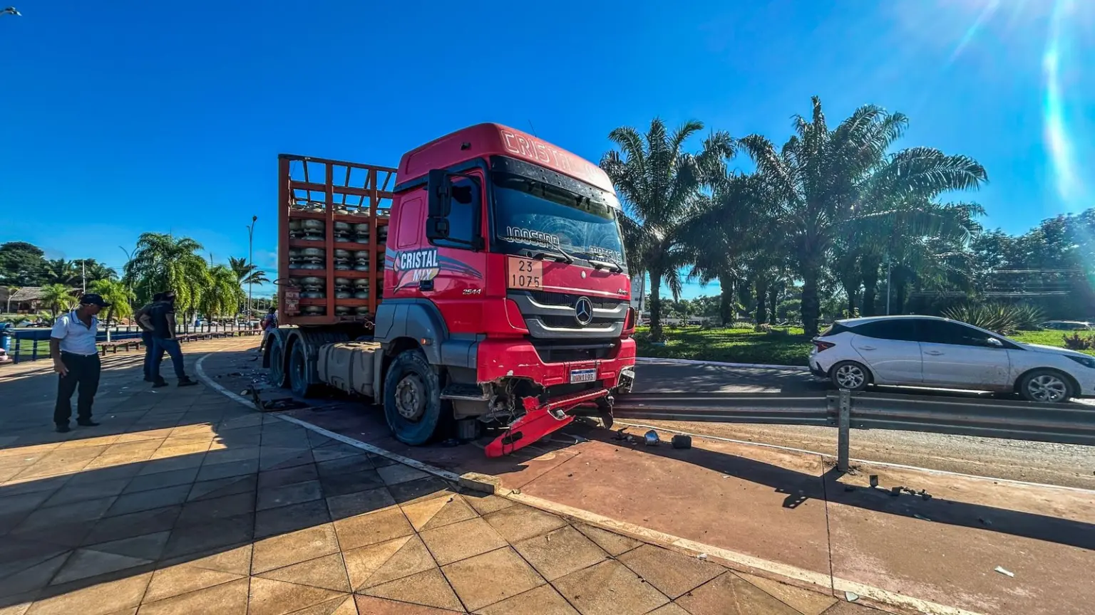 Caminhão perde controle e bate em proteção metálica de rotatória causando congestionamento