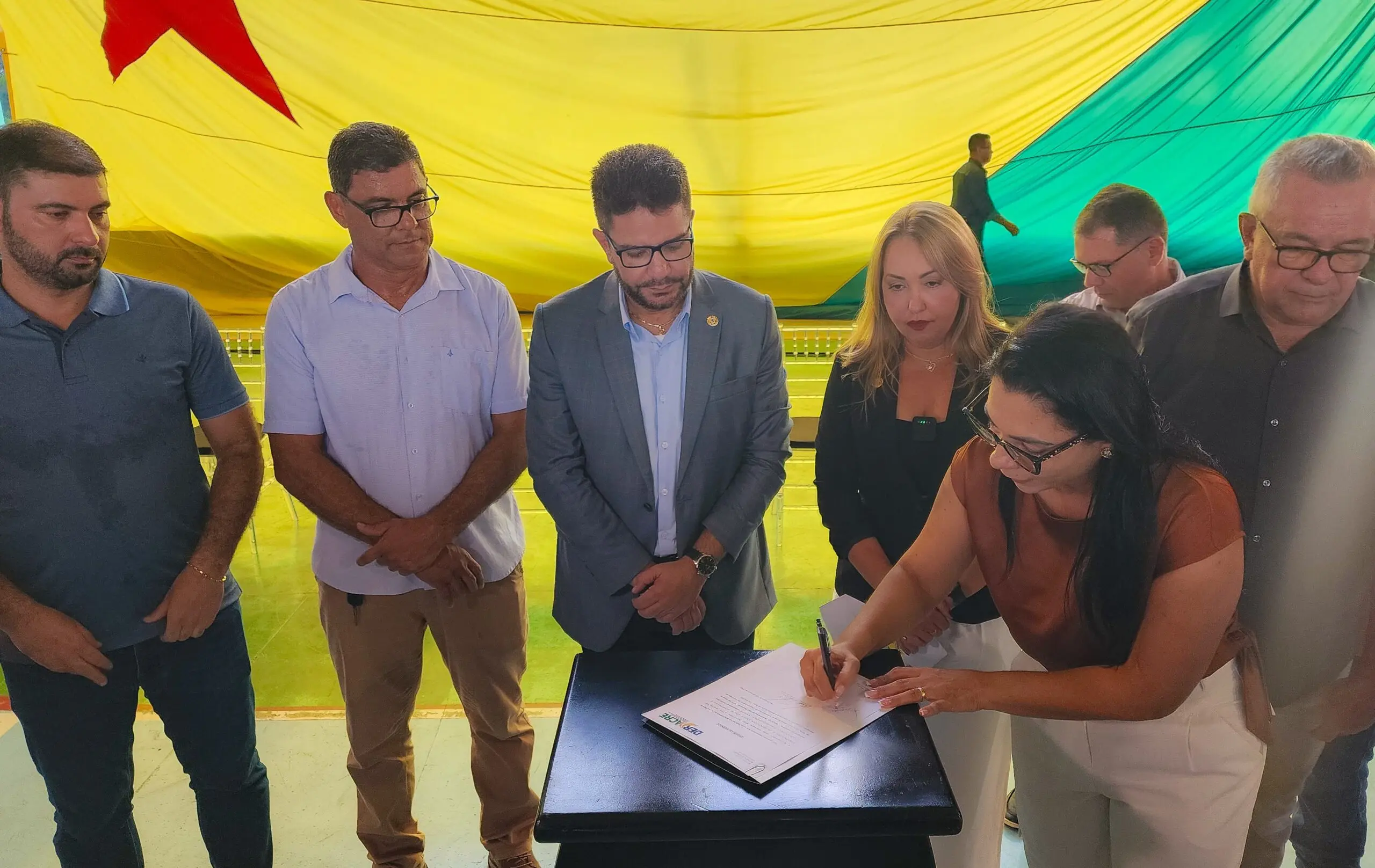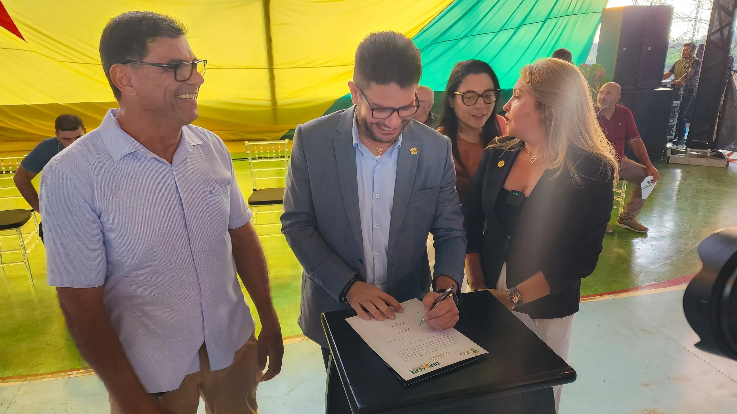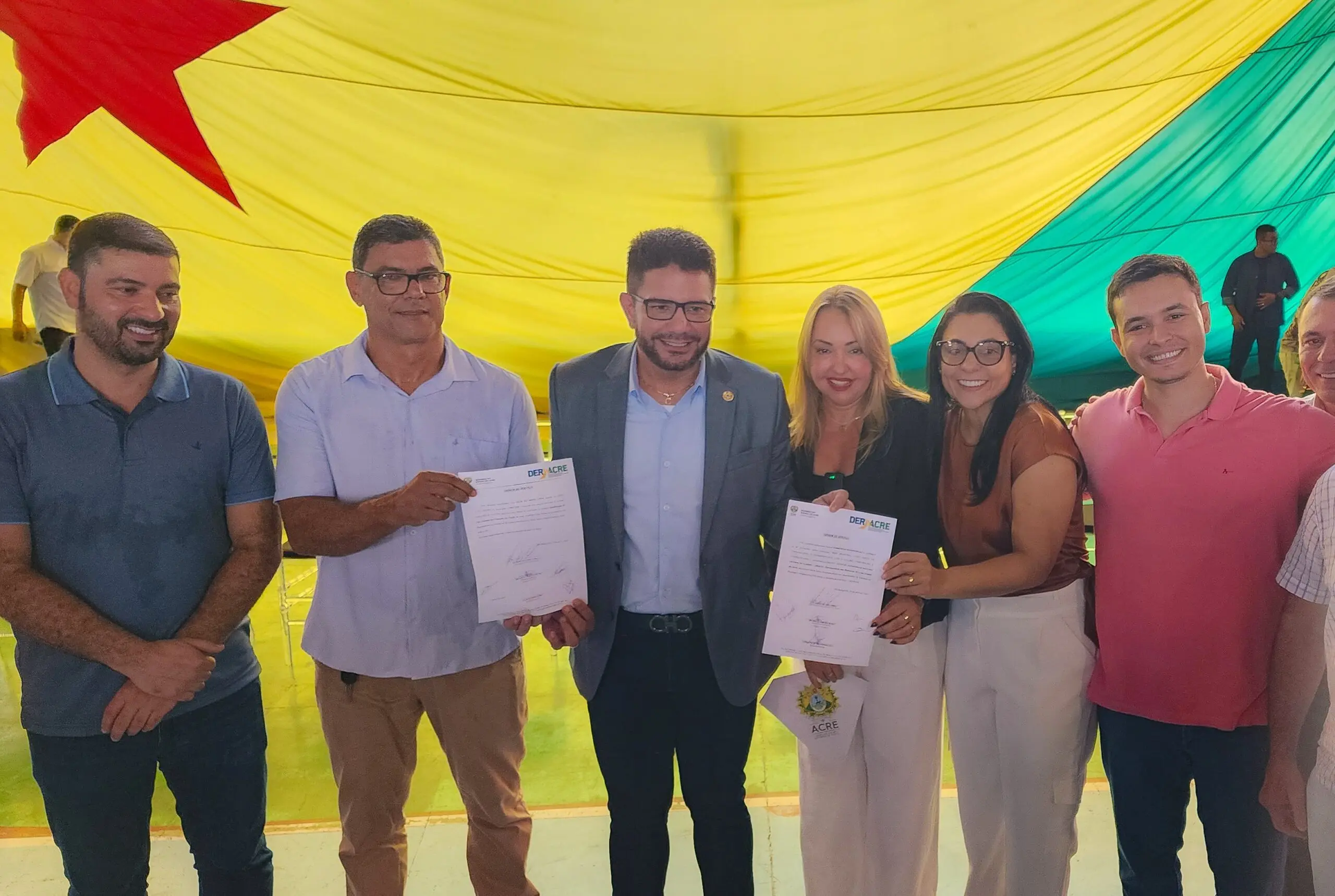 O projeto prevê o serviço de tapa-buraco, construção de camada dupla e recapeamento das rodovias. Ao lado de Gladson, estavam os prefeitos de Senador Guiomard (Rosana Gomes), Capixaba (Manoel Maia) e Plácido de Castro (Camilo Silva).