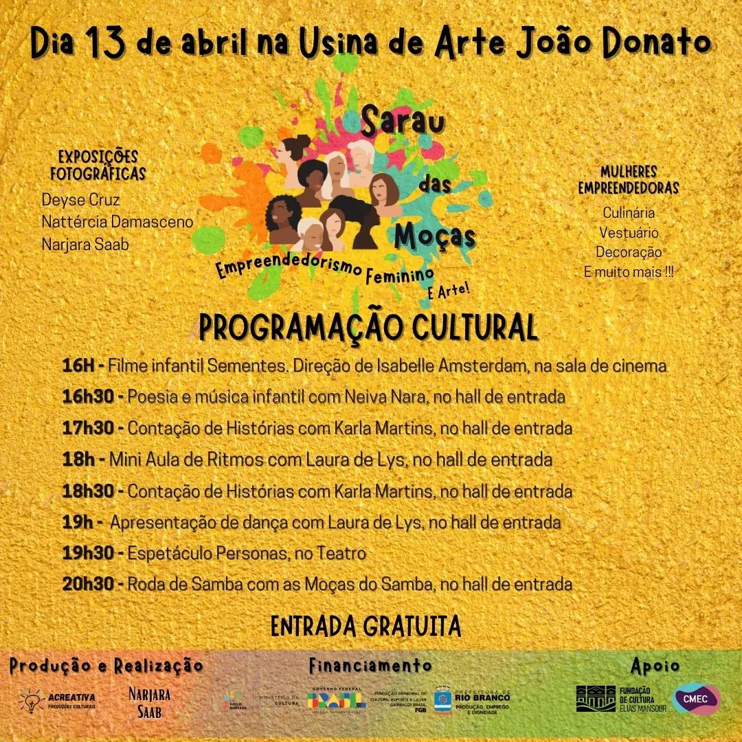 “Venha fortalecer o protagonismo feminino e usufruir de uma programação espetacular”, diz a organização. O evento tem financiamento da Lei Paulo Gustavo – Edital FGB, com produção e realização da artista Najara Saab e AcreativaProduções, além do apoio da CMEC e Fundação Elias Mansour. A entrada é gratuita e a programação tem início às 16h.