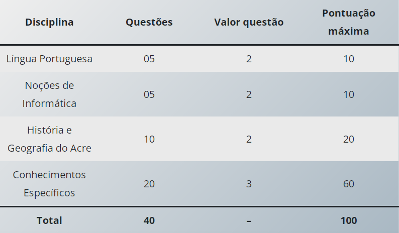 - obteve nota inferior a 40% da soma dos pontos obtidos nas disciplinas de Língua Portuguesa, Noções de Informática e História e Geografia do Acre;