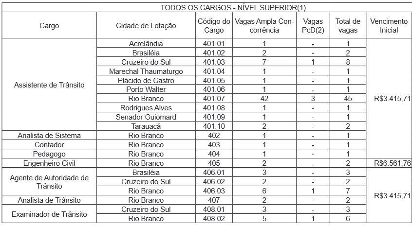 Estão abertas as inscrições para o concurso Detran AC (Departamento Estadual de Trânsito do Acre) que oferece 91 vagas de nível superior.