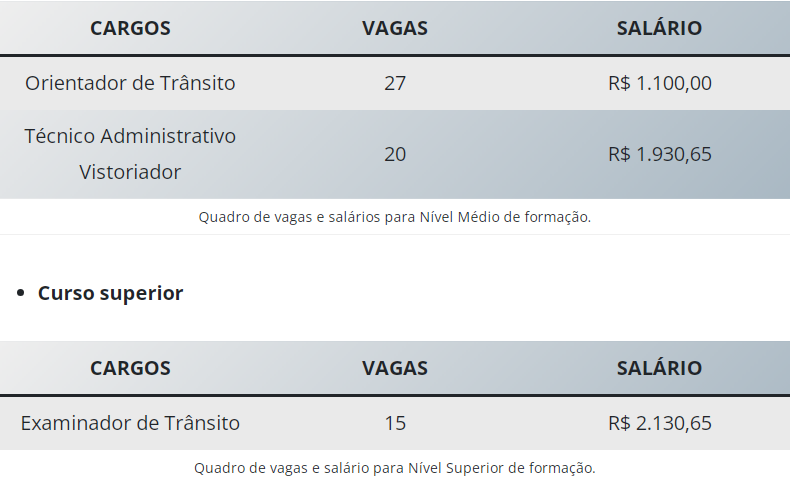 - Cargos: Orientador, Técnico Administrativo e Examinador de Trânsito