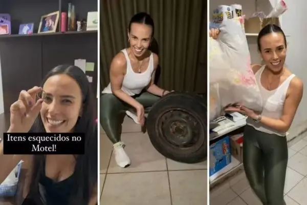 Entre os objetos deixados para trás durante as “passadinhas” no motel estão alianças, chave de carro, travesseiro e até pneu. Segundo um seguidor, “só com esse vídeo ela [a empresária] conseguiu acabar uns três casamentos”. Veja as imagens: