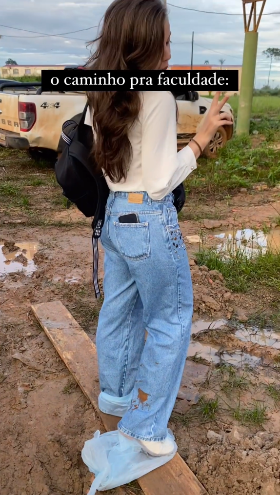 Com estradas cheias de lama, veículos em condições duvidosas e muitas vezes amontoados na carroceria de camionetes, a jovem brinca, colocando a frase “o caminho para a faculdade”, junto às imagens. Em tom de descontração, a legenda da publicação ainda vem dizendo “Com ou sem emoção?”.