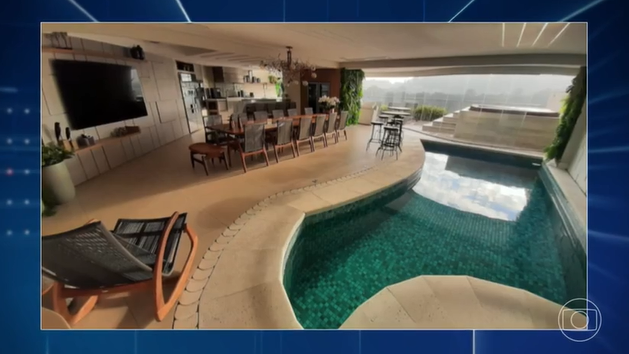 A piscina privativa é só um dos atrativos do apartamento. O espaço de lazer tem televisão de 70 polegadas, mesa para 14 lugares, churrasqueira e um ofurô na varanda.