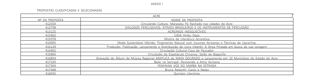 Na edição do Diário da União desta sexta-feira (26), o Ministério da Cultura, por meio da Secretaria de Economia Criativa e Fomento, divulgou o resultado final da etapa de seleção das propostas inscritas no Edital de Chamamento Público do Programa Rouanet Norte.