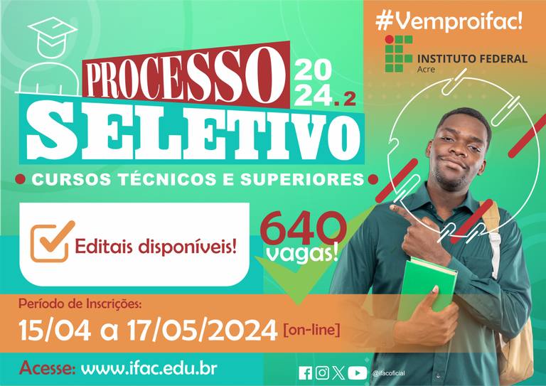 O Instituto Federal do Acre (Ifac) lançou, nesta quinta-feira (11.04), os editais para o Processo Seletivo 2024/2 de cursos técnicos subsequentes e superiores.