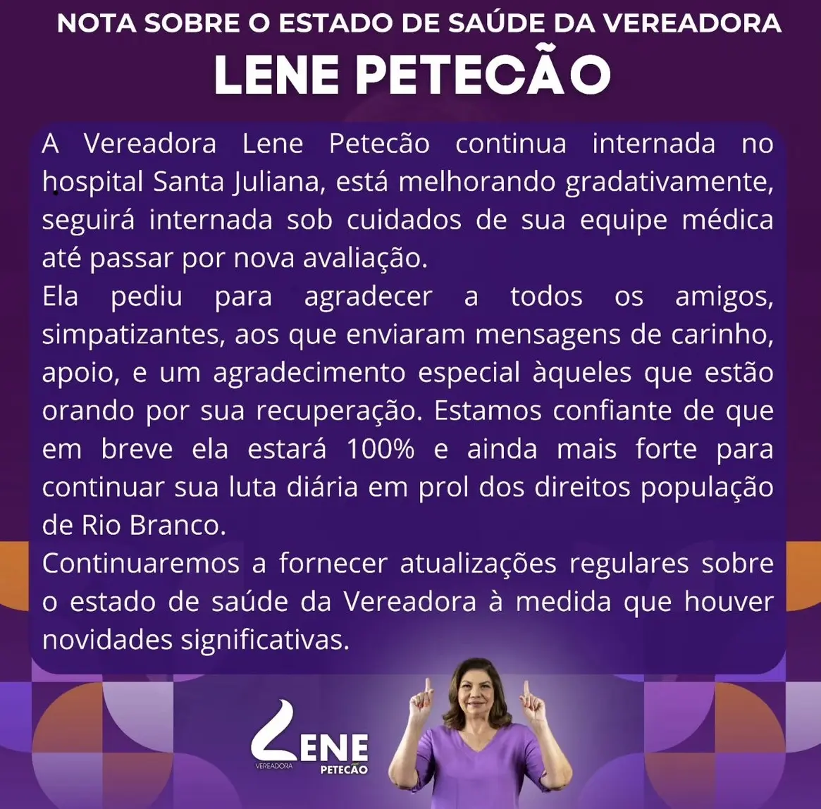 O novo boletim médico sobre a vereadora Lene Petecão (PSD), divulgado nesta segunda-feira (8), informou que a parlamentar apresentou melhora no estado de saúde.