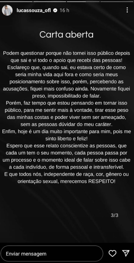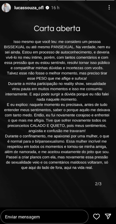 No texto, Lucas Souza fala de pressão e se assume bisssexual e pansexual: “Então, vamos lá, pessoal! Primeiramente, quero explicar para vocês o porquê estou tomando essa decisão! A minha vida toda foi sempre pautada pela coragem. As necessidades e dificuldades pelas quais eu já passei na vida fizeram com que, desde cedo, eu tivesse muita coragem”, começou.