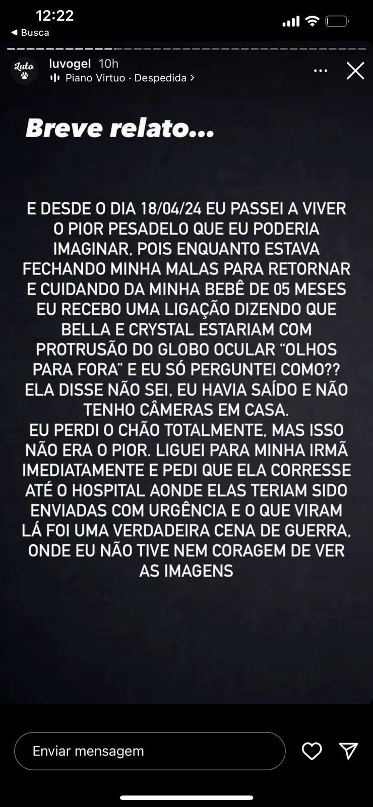 Nas redes, Luciana afirma que recebeu uma ligação do estabelecimento onde os cachorros estavam hospedados relatando que os animais tiveram ferimentos graves durante a madrugada. Segundo a mãe dos cachorros, que estava em uma viagem de trabalho, os proprietários afirmaram que não sabiam o que resultou no ocorrido já que o lugar não tinha câmeras de segurança no local e nem vigia, o que dificultava a compreensão das circunstâncias exatas do ocorrido.