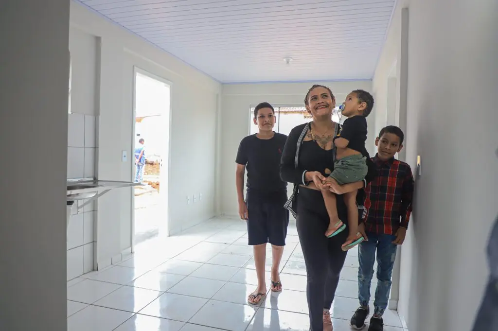 Os filhos que foram carregados pela mãe no dia da enchente, hoje seguravam firme a mão dela para conhecer a nova morada.