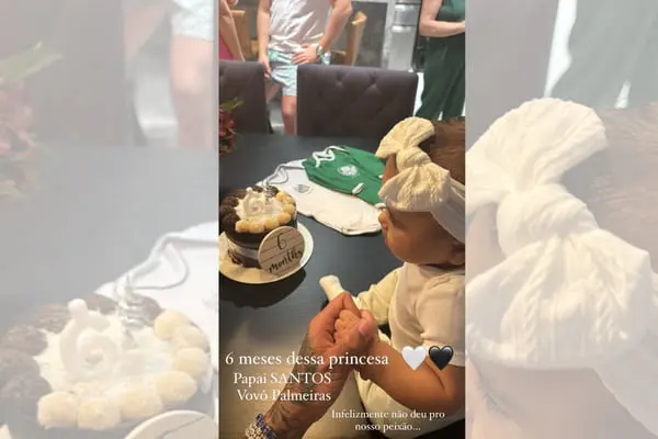 Mavie, filha do jogador Neymar com a modelo Bruna Biancardi, comemorou seu seis meses de vida no melhor estilo “final do Paulistão”, com macacões do Santos e Palmeiras.