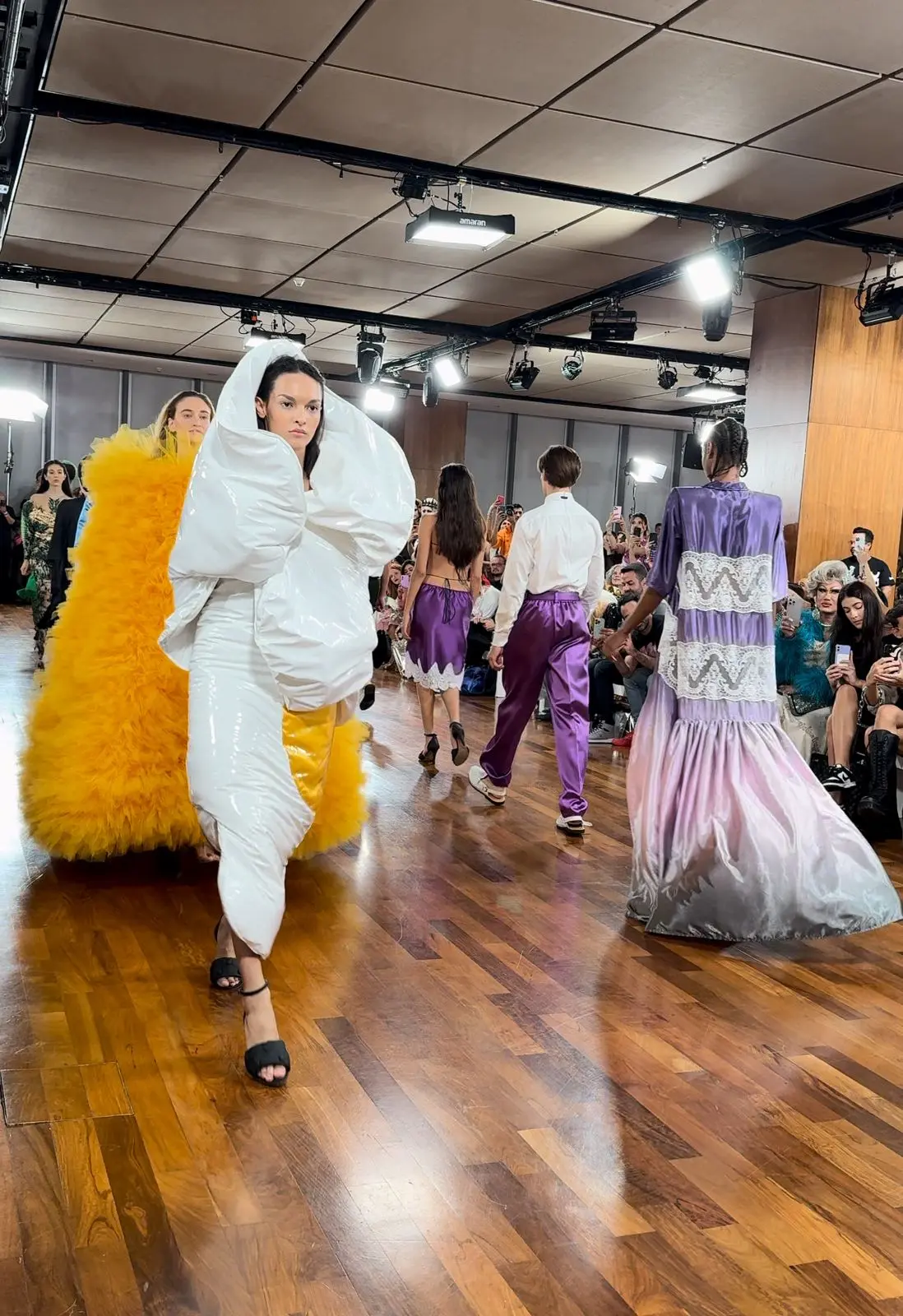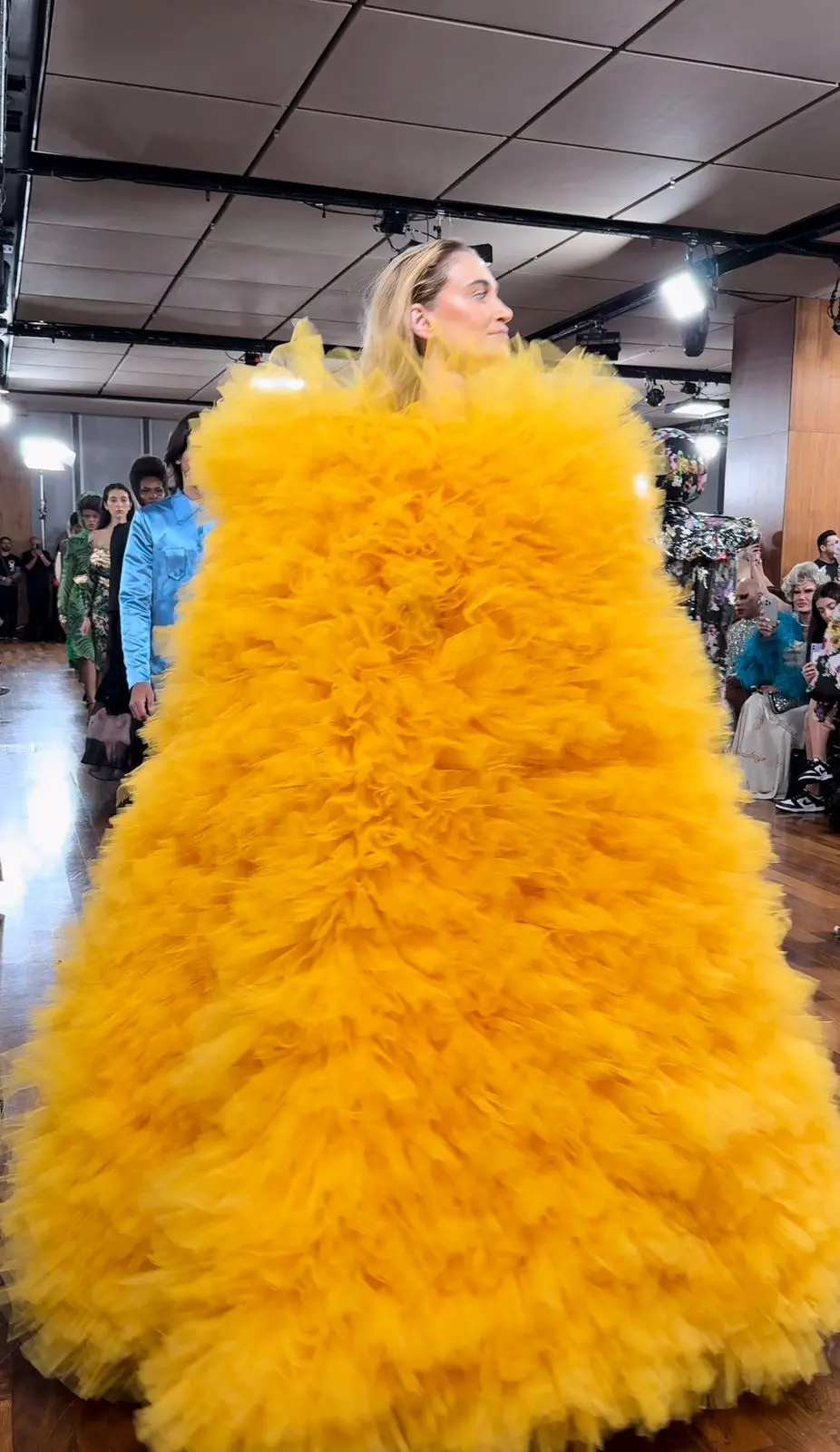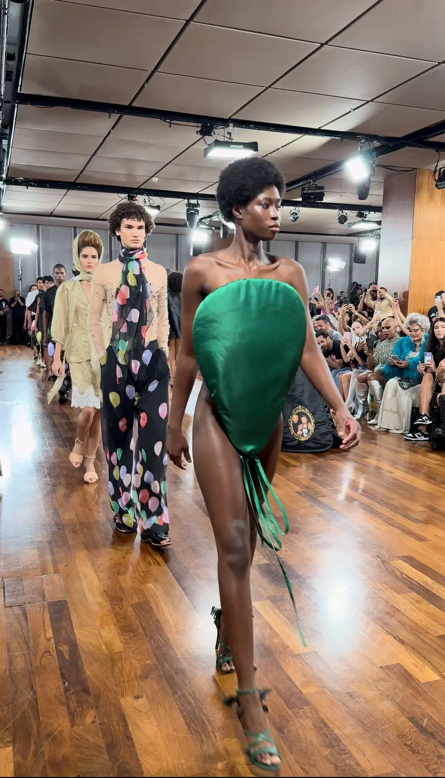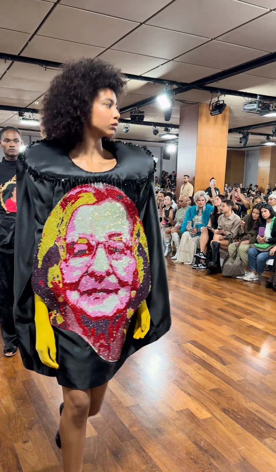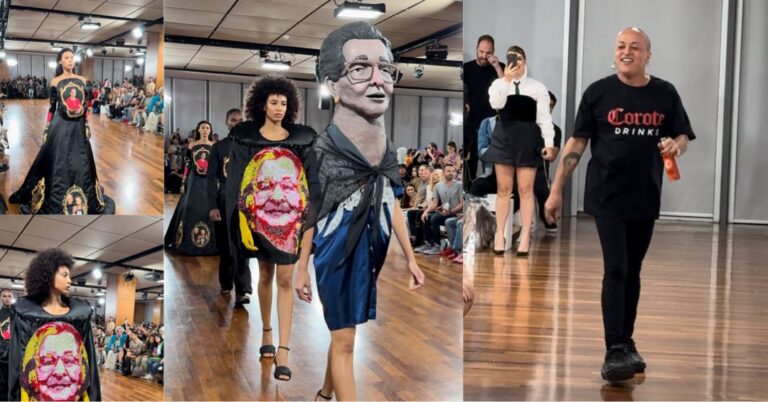 Um exemplo emblemático desse tributo gastronômico foi o vestido cuscuz em tule amarelo, usado pela deslumbrante Vivi Orth, e o look que surpreendeu a todos ao exibir dois ovos fritos em vinil, habilmente moldados para abraçar a silhueta da modelo. Cada criação era mais do que uma peça de roupa; era uma história contada através de tecidos e costuras, uma narrativa visual que ecoava as tradições e aconchegos da casa de infância do estilista em Pernambuco.
