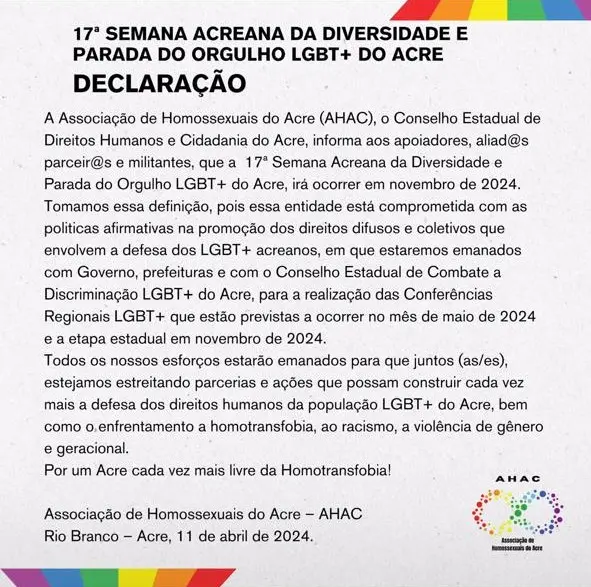A Associação de Homossexuais do Acre (AHAC) divulgou, na última quinta-feira (11), a data para a 17ª Semana Acreana da Diversidade e Parada do Orgulho LGBT+ do Acre. O evento deve acontecer em novembro de 2024, segundo a organização, que afirmou que a entidade “está comprometida com as políticas afirmativas na promoção dos direitos difusos e coletivos que envolvem a defesa dos LGBT+ acreanos, em que estaremos emanados com o Governo, prefeituras e com o Conselho Estadual de Combate a Discriminação LGBT+ do Acre”, disse.