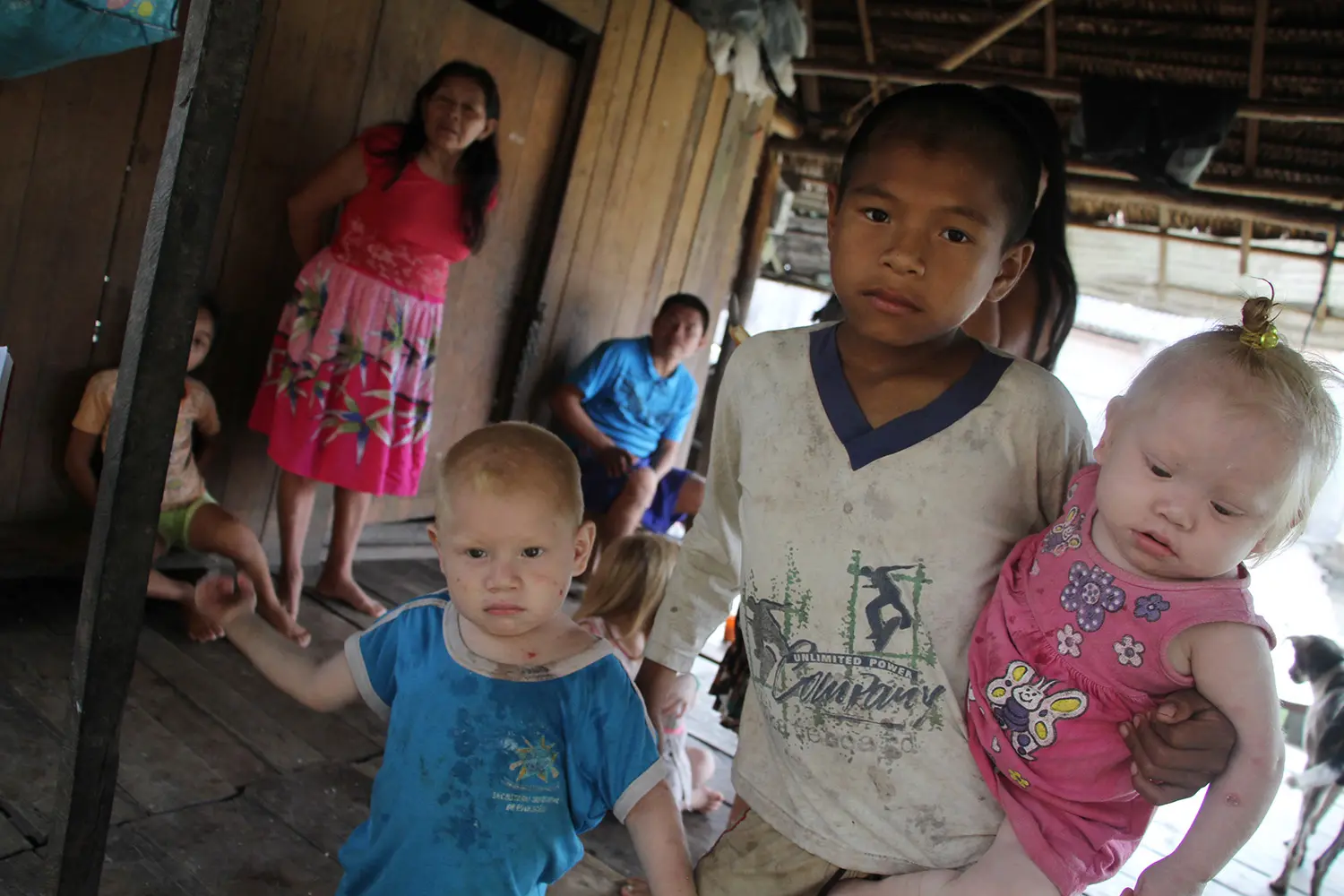 A deficiência na produção de melanina causada por uma mutação genética faz com que as pessoas nesta situação tenham a pele muito branca e apresentem alterações na cor dos olhos e dos cabelos. Por isso, essas crianças têm dificuldade de enxergar e o corpo arde com o calor intenso do sol, enquanto centenas de insetos machucam, todos os dias, braços, pernas e pescoço numa voracidade cujo resultado é sangramento constante. Desse modo, morar na aldeia Nova Mudança, a oito horas de barco descendo o Rio Purus, desde Santa Rosa, é um martírio.