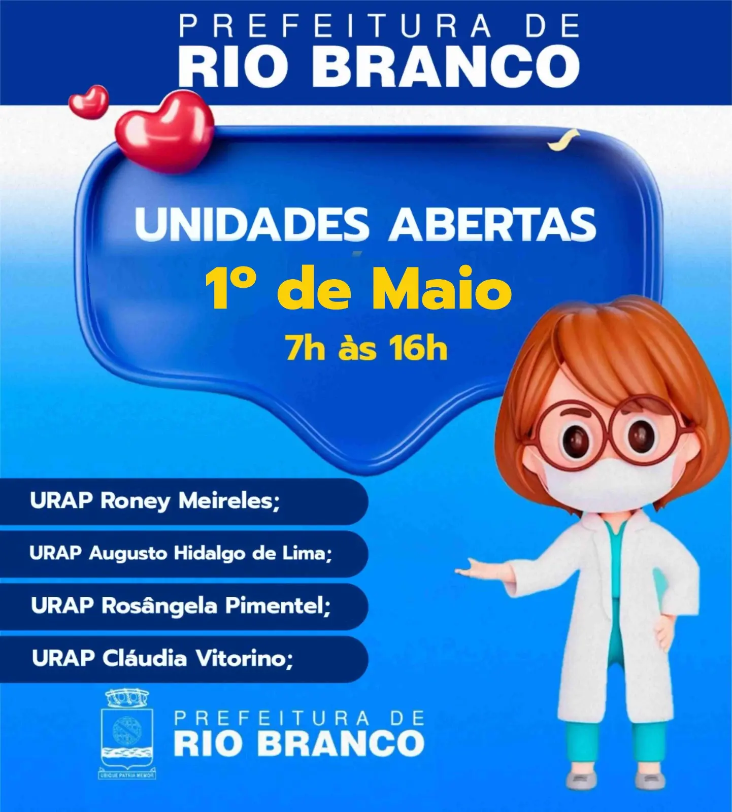 A Secretaria de Saúde de Rio Branco informou que no feriado desta quarta-feira (1), Dia do Trabalhador, quatro Unidades de Referência da Atenção Primária (URAP) estarão abertas.