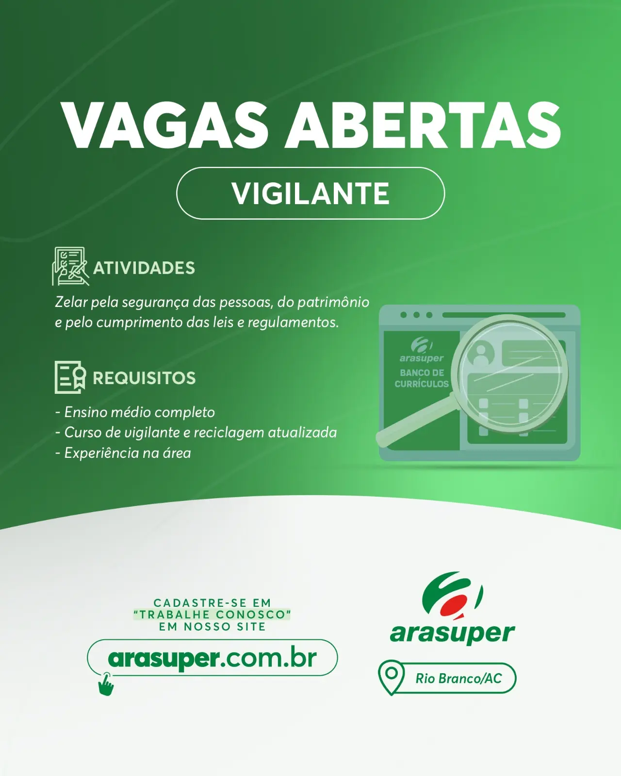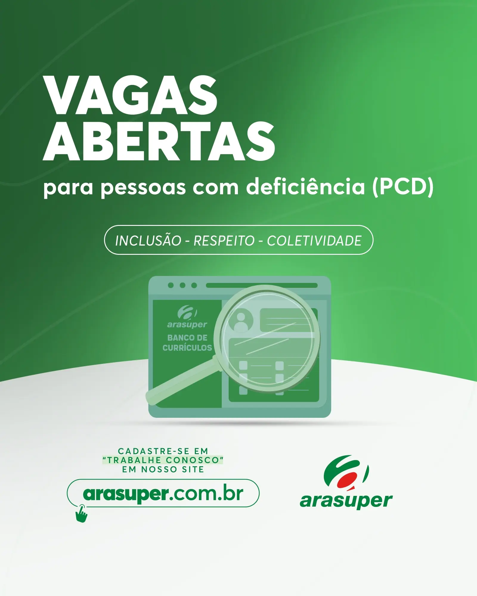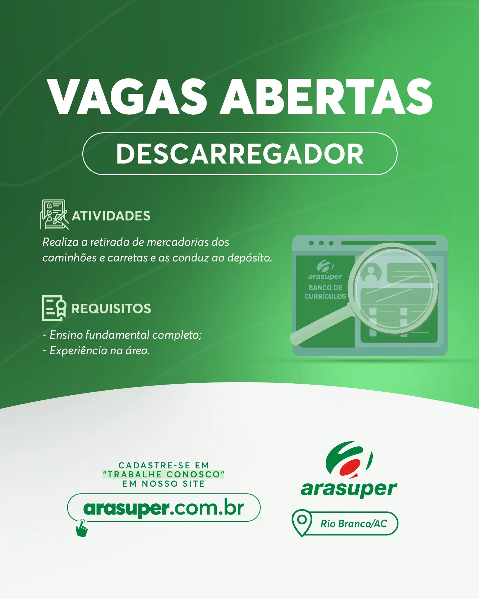 “Estamos contratando Venha fazer parte da nossa equipe! Cadastre-se no nosso site http://arasuper.com.br na Aba trabalhe conosco. Arasuper, sempre ao seu lado 💚”, destaca a rede na legenda das publicações.