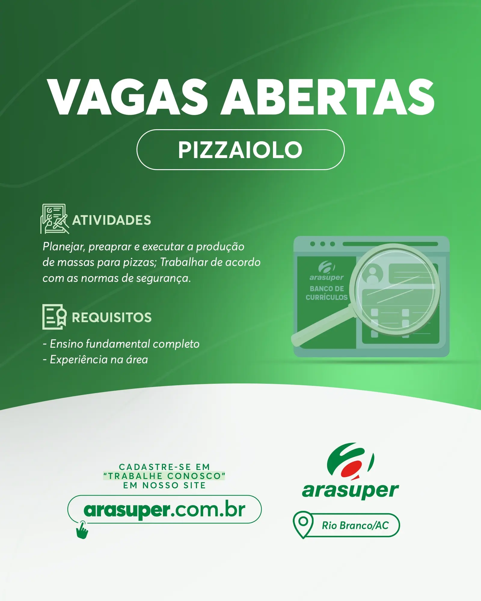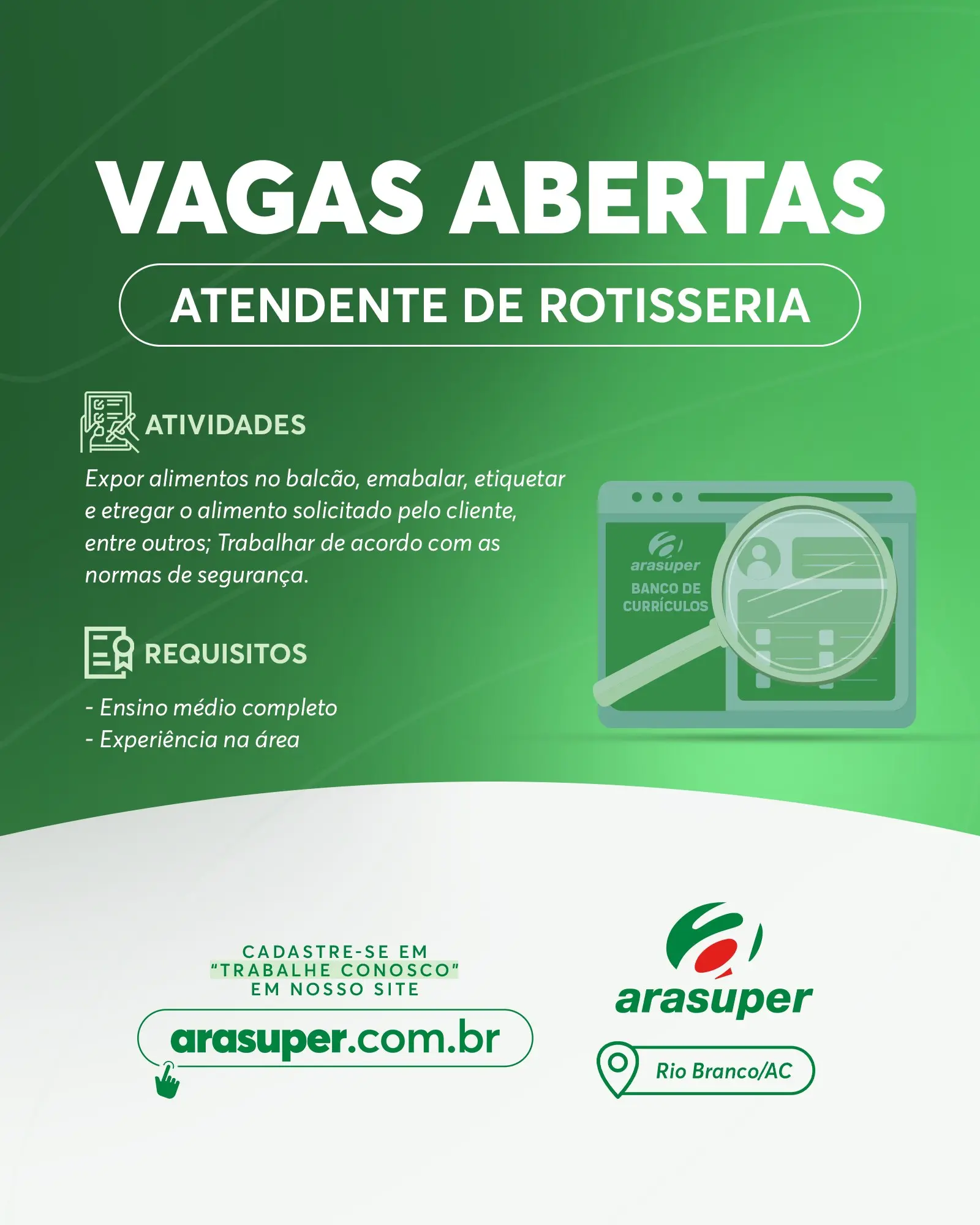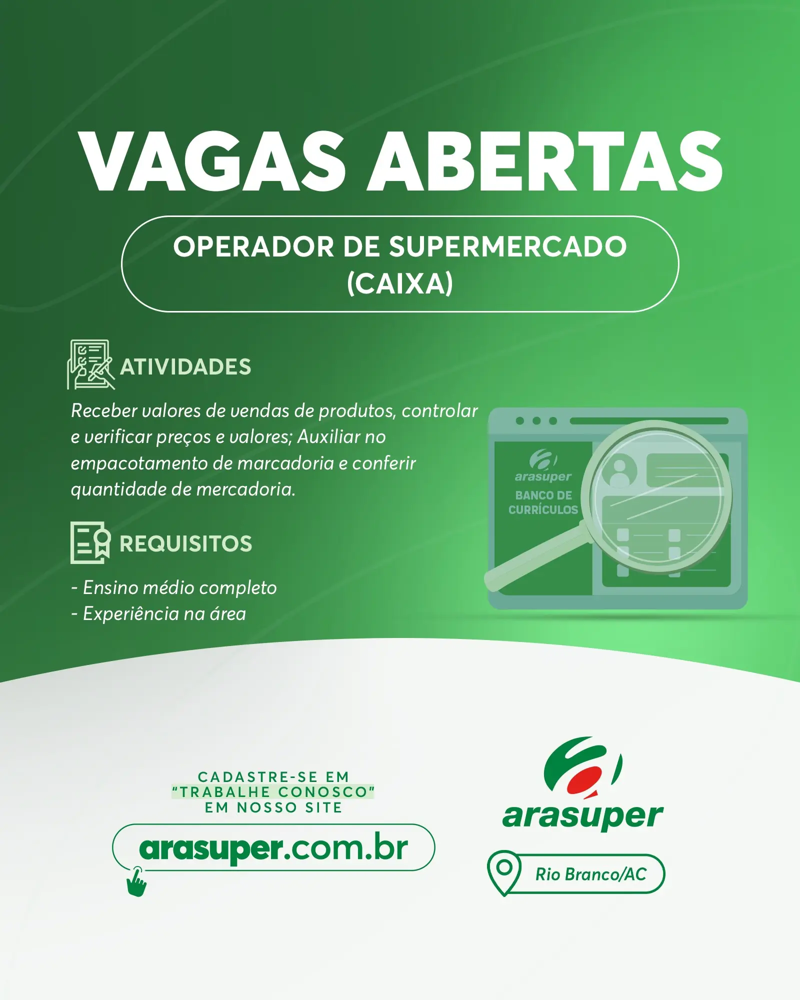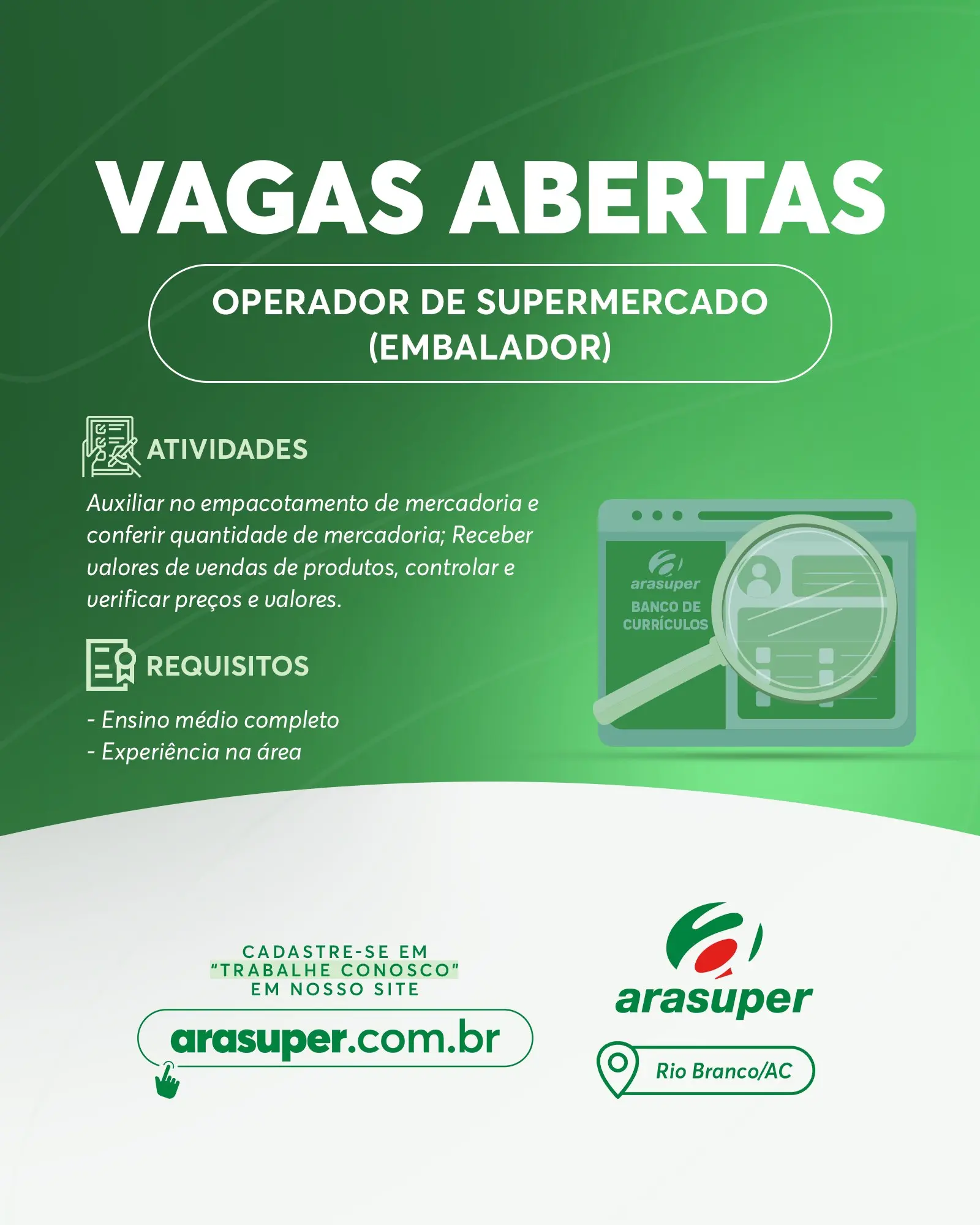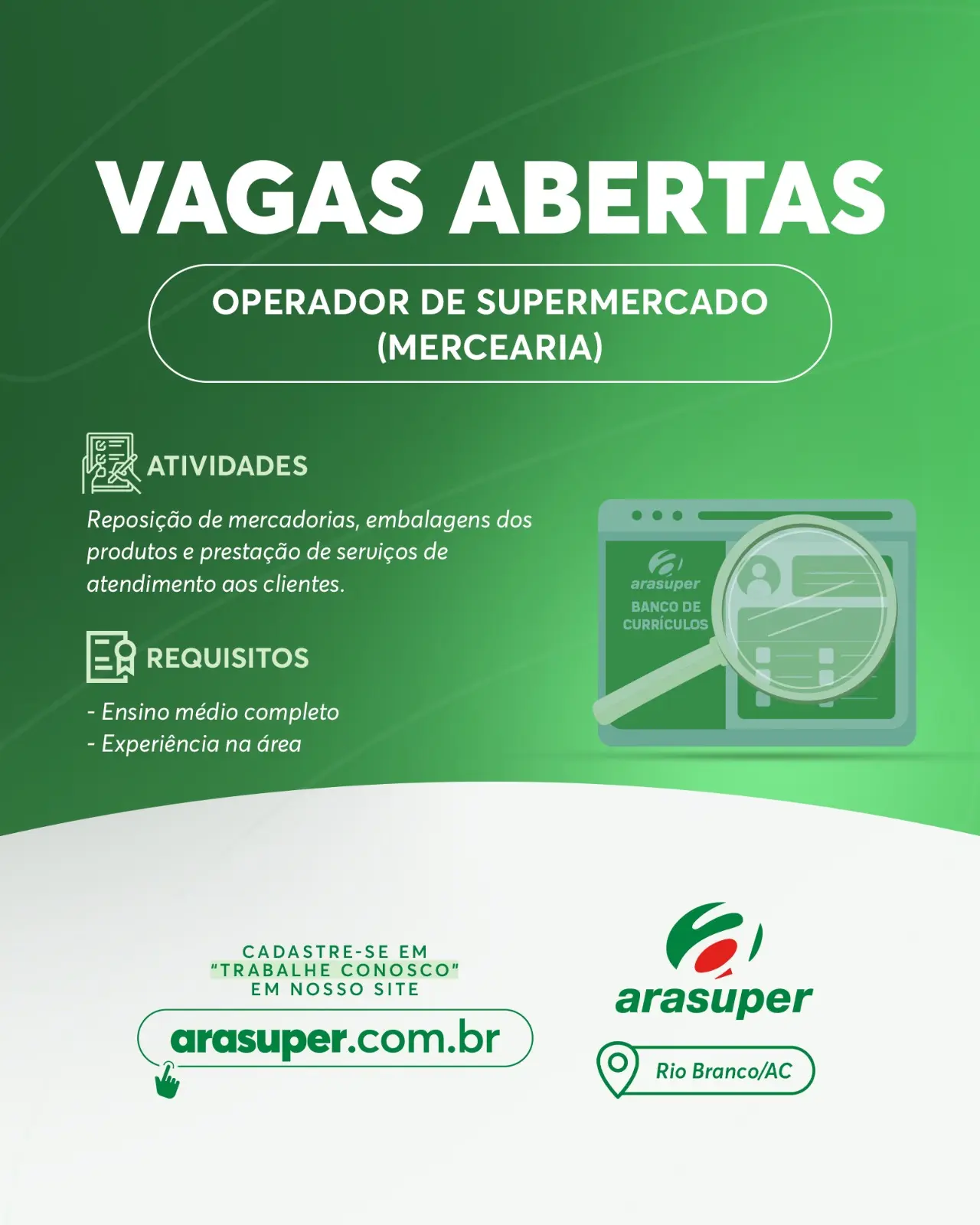 A rede de supermercados Arasuper, que recentemente recebeu o maior prêmio do ramo de supermercados do Brasil pelas lojas em Rio Branco e Porto Velho, divulgou na última quinta-feira (11) nas redes sociais, diversas vagas de emprego para Rio Branco/AC.