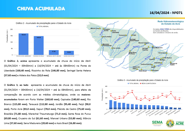 O Rio Acre em Rio Branco apresenta nível de 5,84, mostrando-se abaixo da média de 9,05 para o período. Também há indicativo de anomalia negativa em rios dos municípios de Santa Rosa do Purus e Assis Brasil, onde as chuvas deverão estar abaixo do esperado para o período.