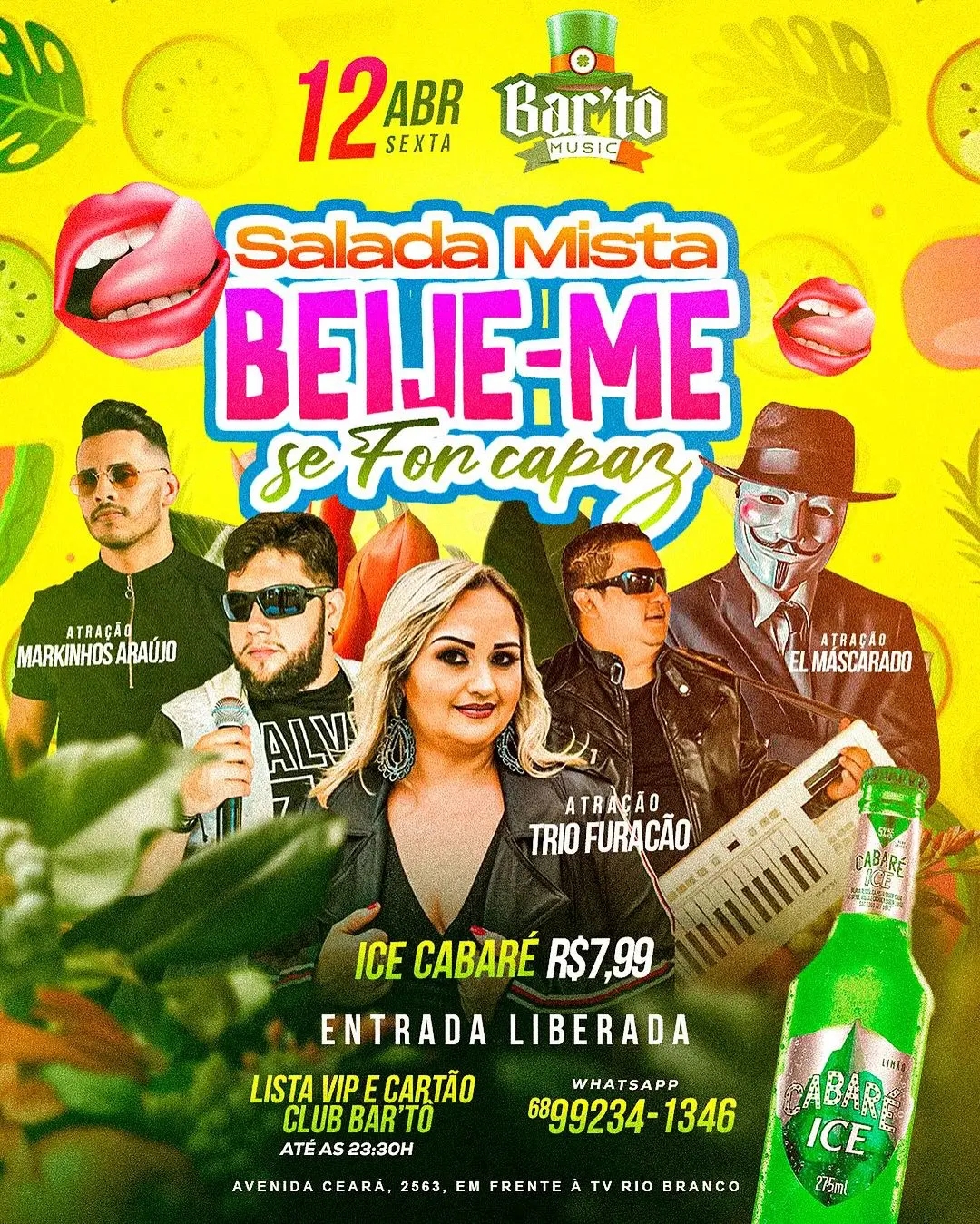 No Bar’tô Music, na sexta-feira (12), tem “Salada Mista, Beije-me se For Capaz”, com Trio Furacão, Markinho Araújo e DJ El Mascarado. Além de promoções de bebidas alcoólicas até às 23h30.