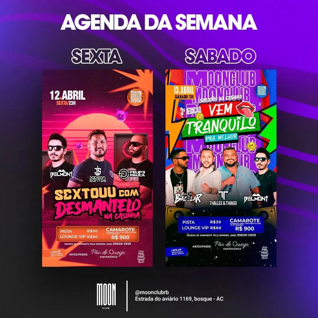 Na Moon Club, sexta tem “Desmantelo na Casinha” com Jadson Santos, Felipe de Paula e Belmont. Sábado tem a 3ª Edição “Vem Tranquilo Pra Melhor” com Thalles e Thiago, Belmont e Neto Bacelar.