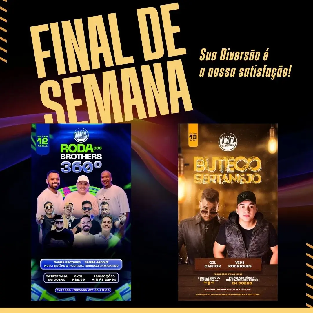 Final de semana no Quintal dos Brothers com o “Roda dos Brothers” na sexta (12) e o Buteco Sertanejo no sábado (13). Com diversos convidados e promoções de bebidas nas apresentações no local.
