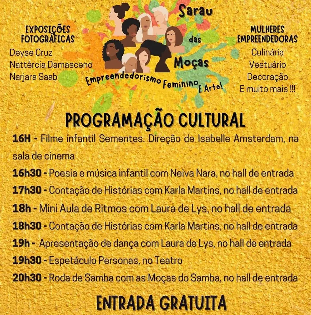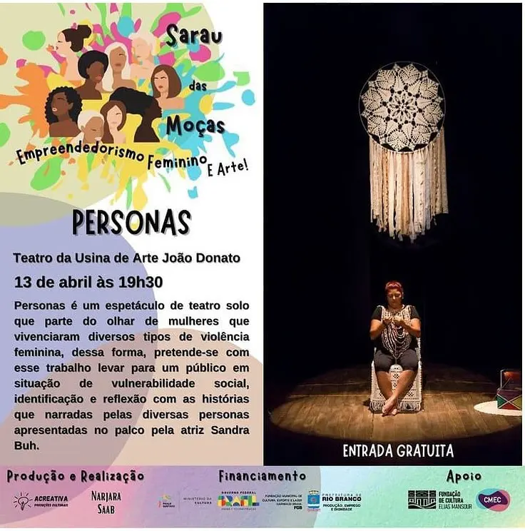 O Sarau Feira das Moças, acontece no sábado (13)! Vai ter música, contação de história, poesia, dança e vai ter também o espetáculo “Personas”. Entrada gratuita.