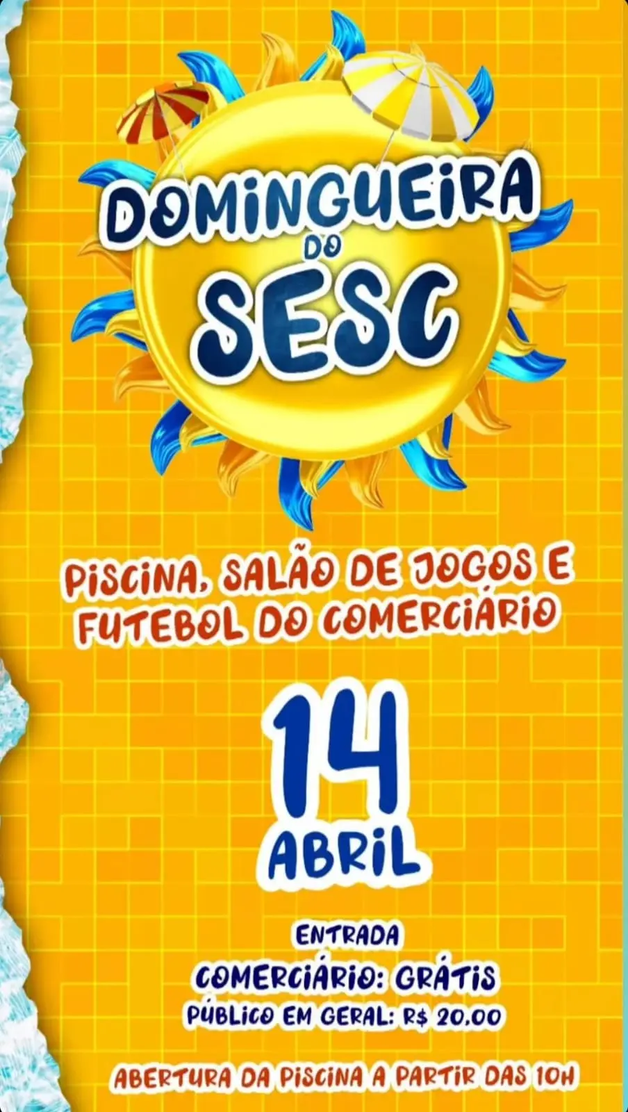 No Sesc, a “Domingueira” está garantida! Piscina, salão de jogos e muito mais aguardam que quiser passar o domingo (14) no espaço. Para o comerciário, a entrada é gratuita, já para o público em geral, a entrada está a 20 reais.
