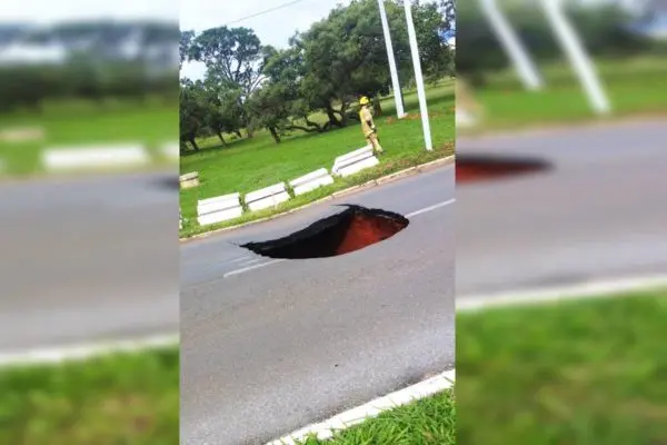 Parte do asfaltou cedeu e um buraco foi aberto no meio de uma via do Distrito Federal. O incidente ocorreu no Setor Policial, no final da Asa Sul.